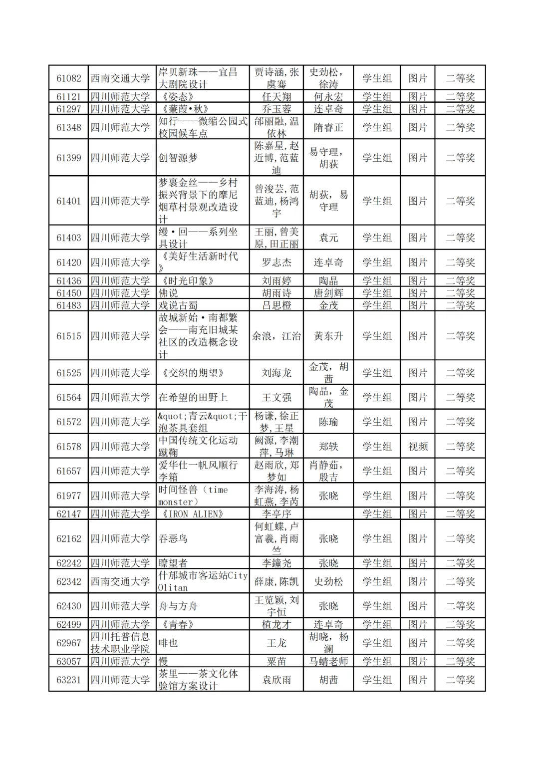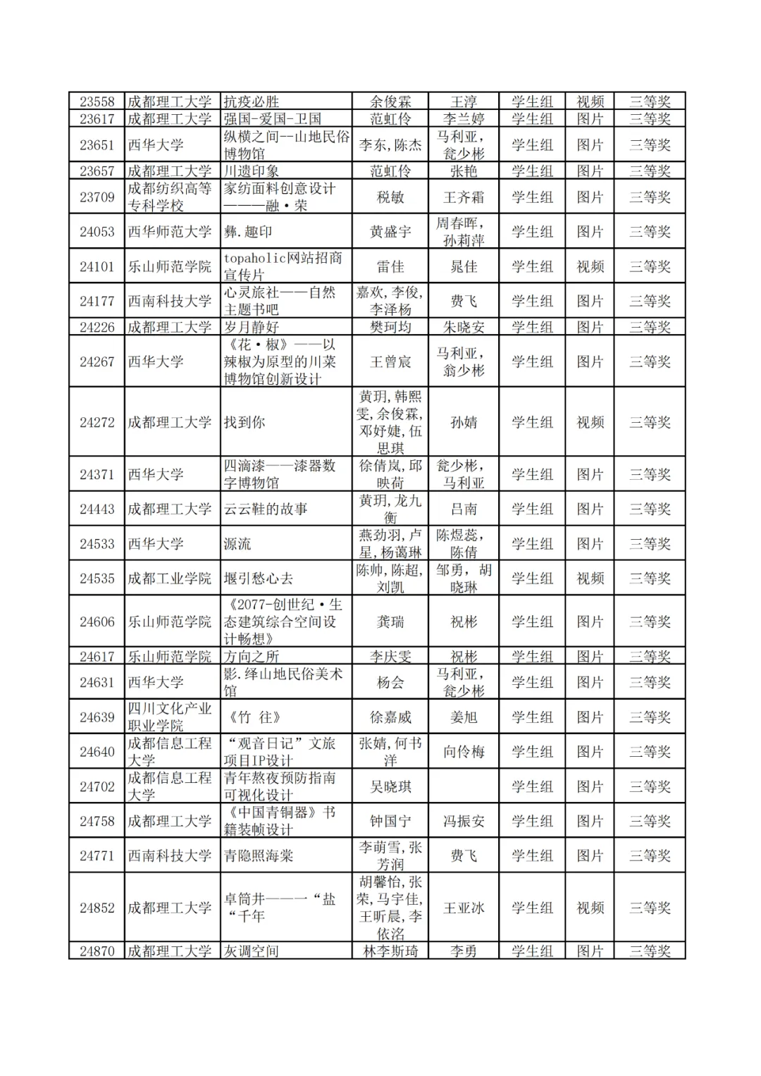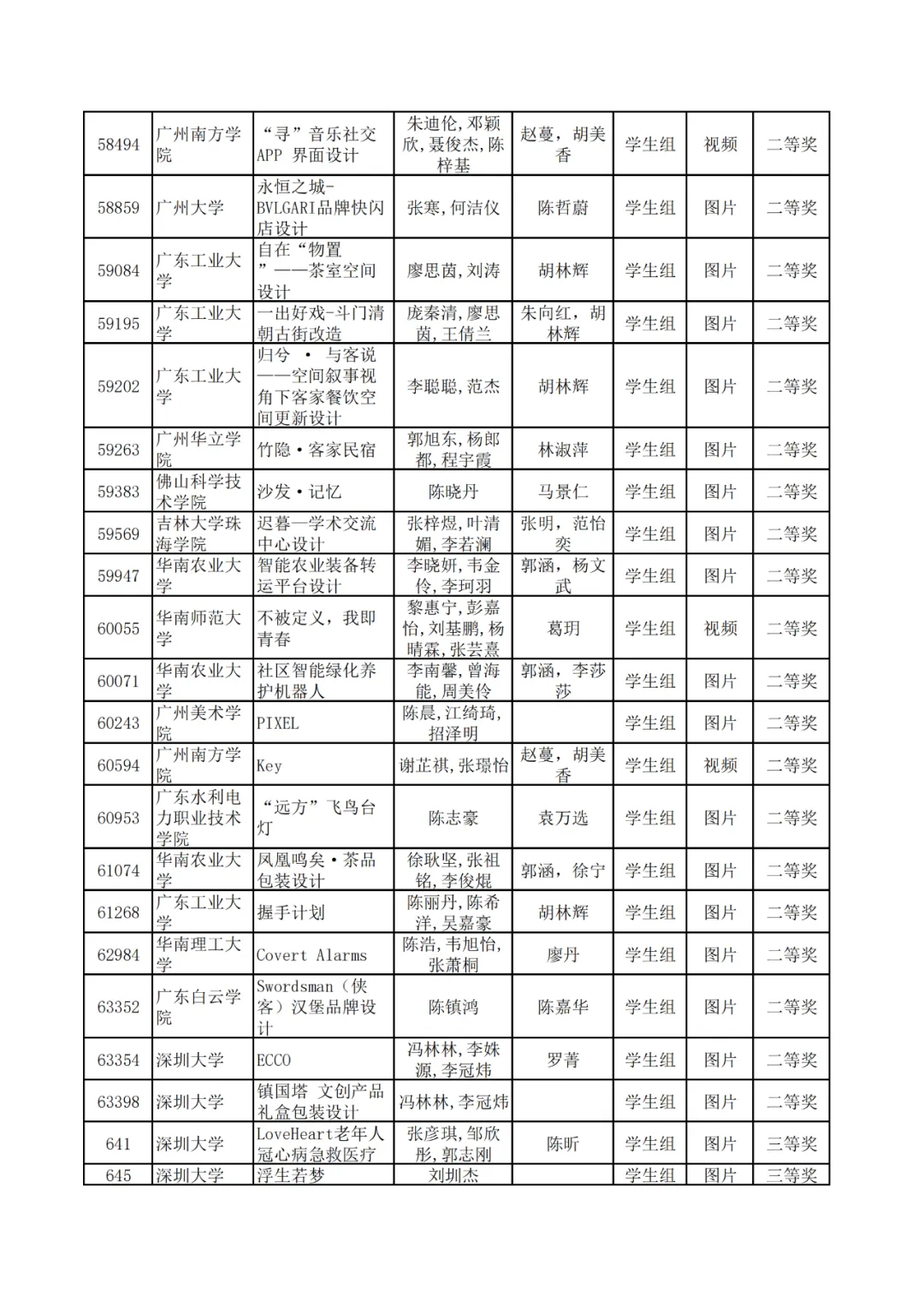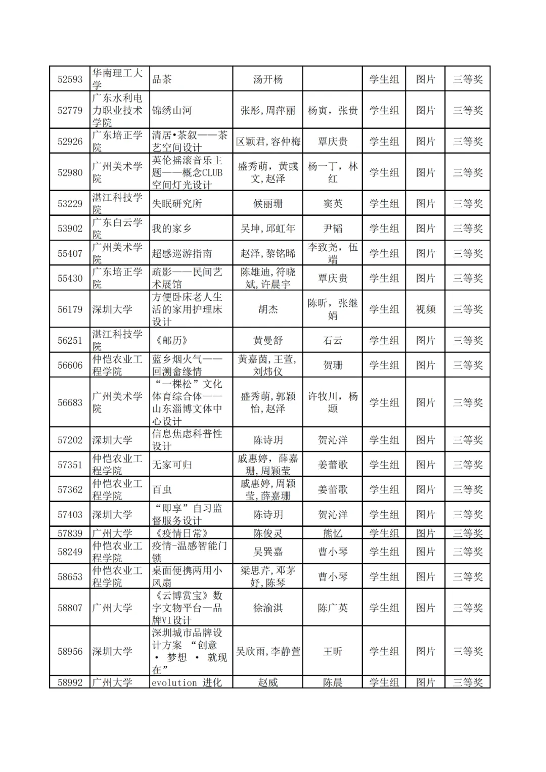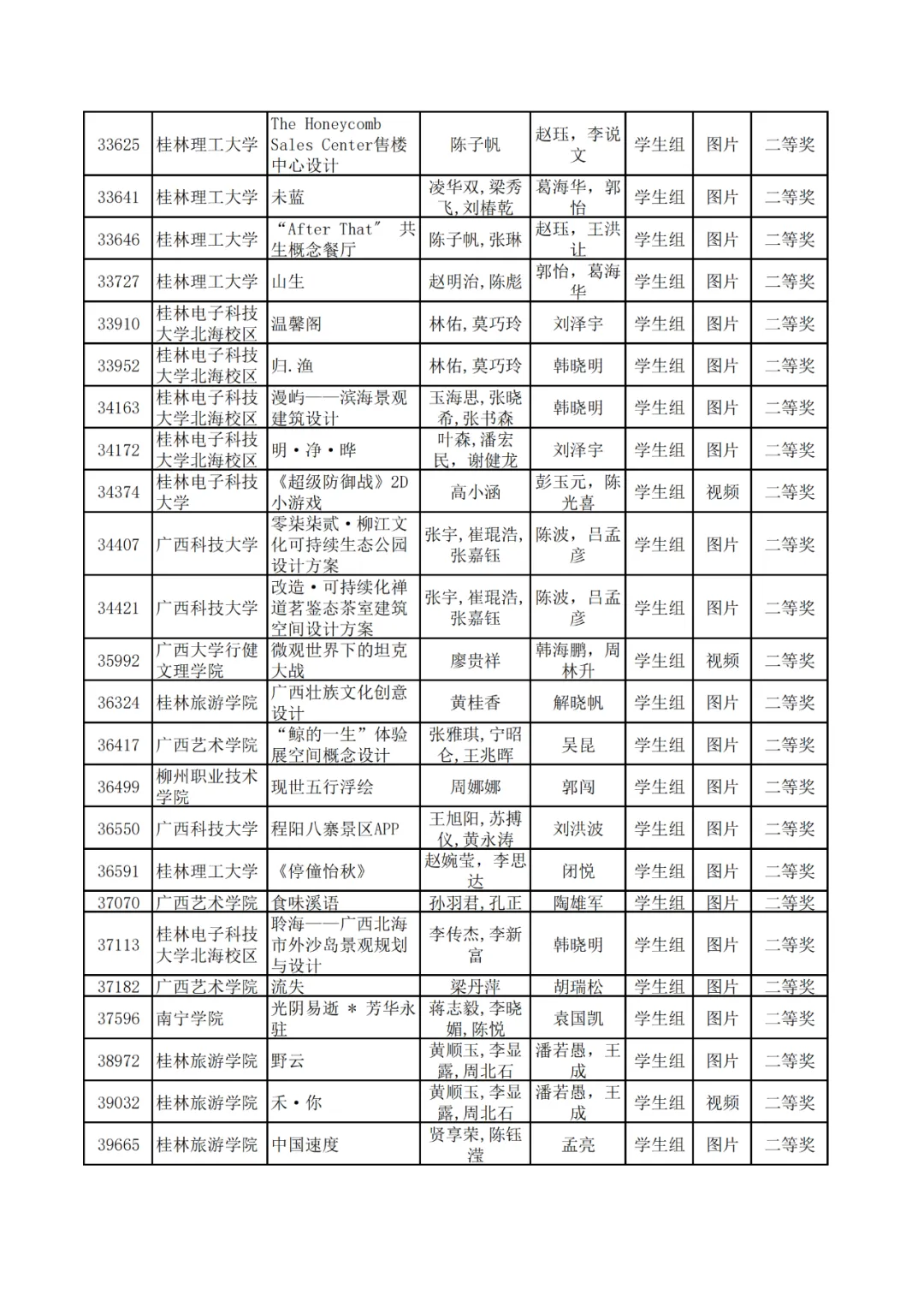 学生组获奖作品表。
