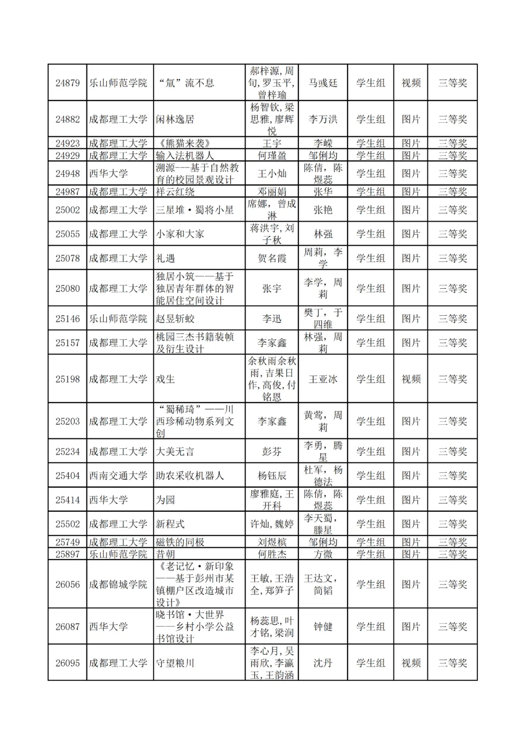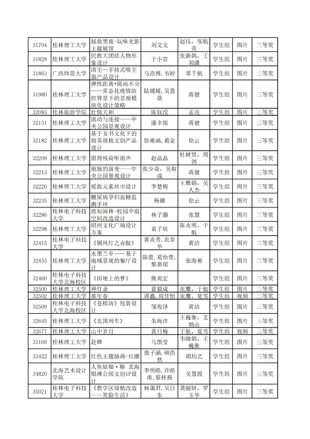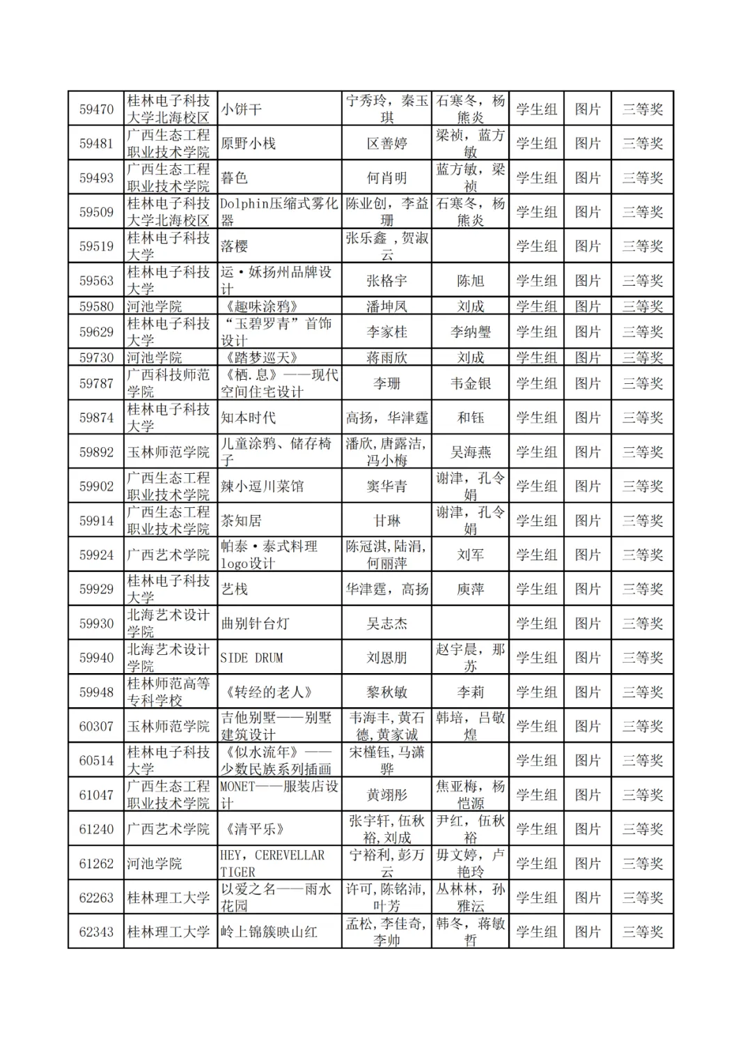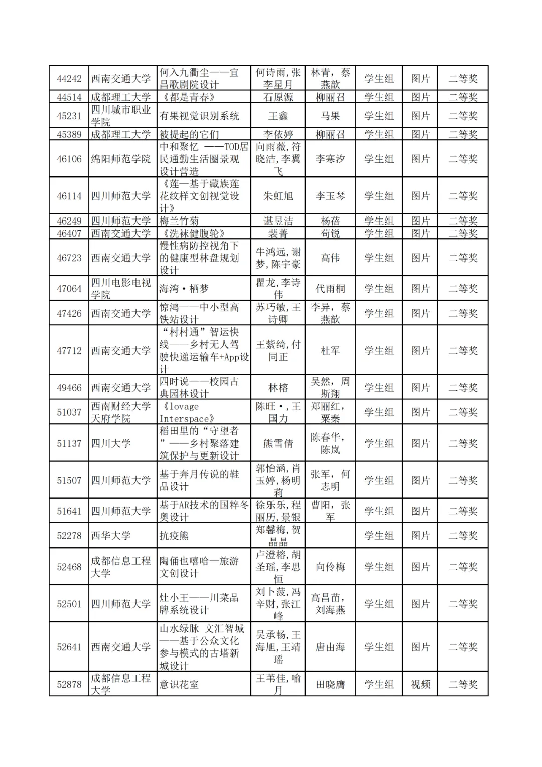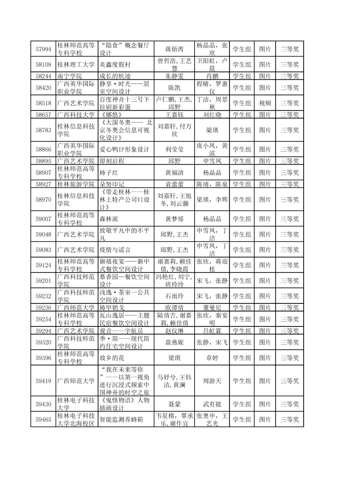 学生组获奖作品表。