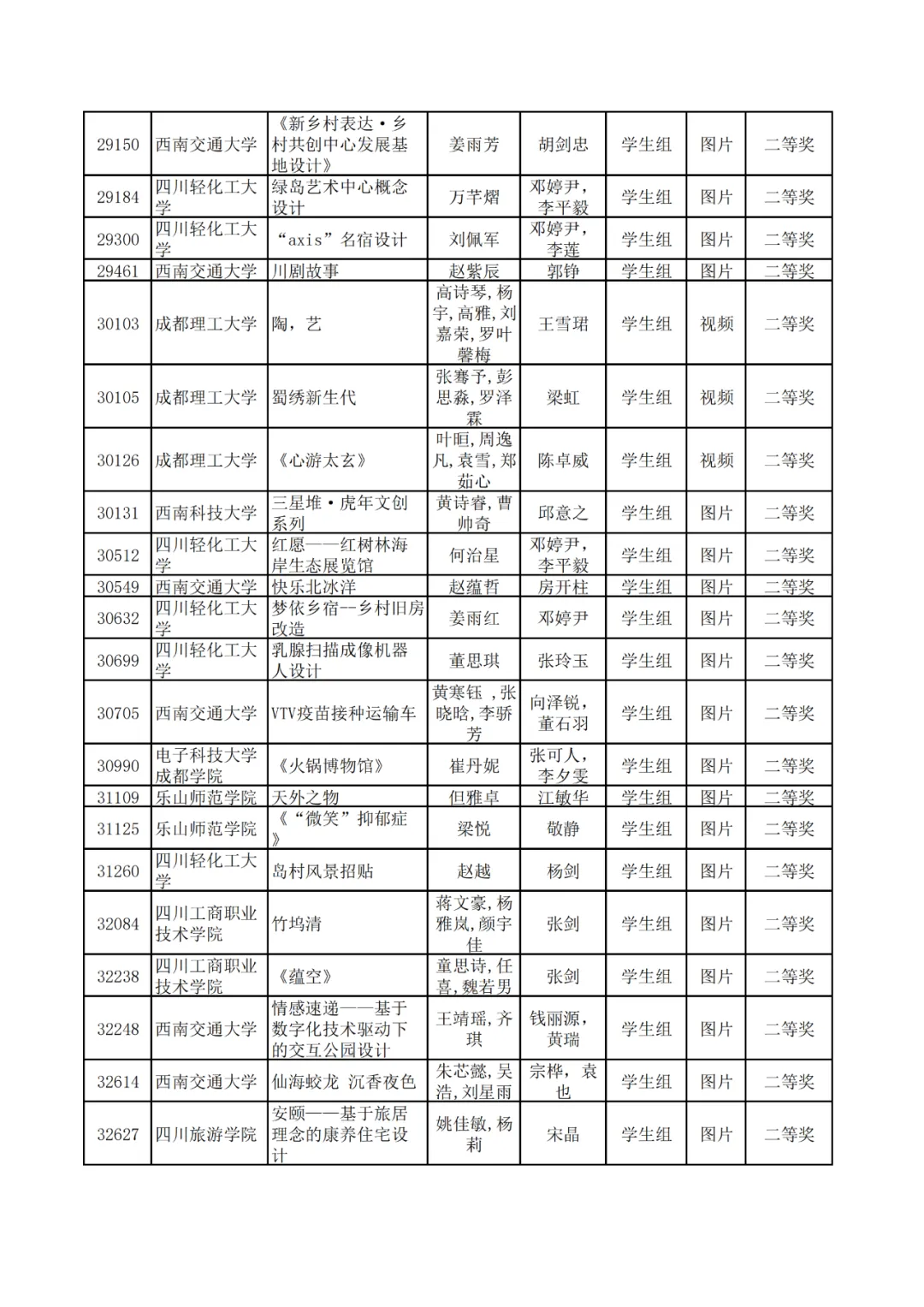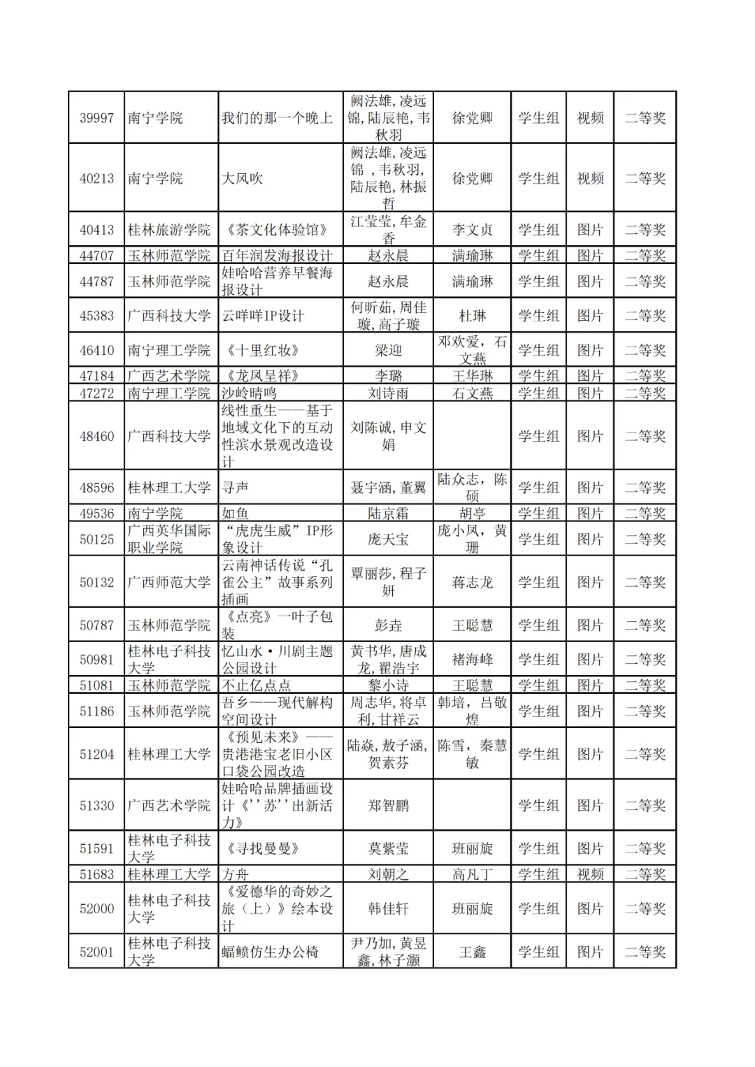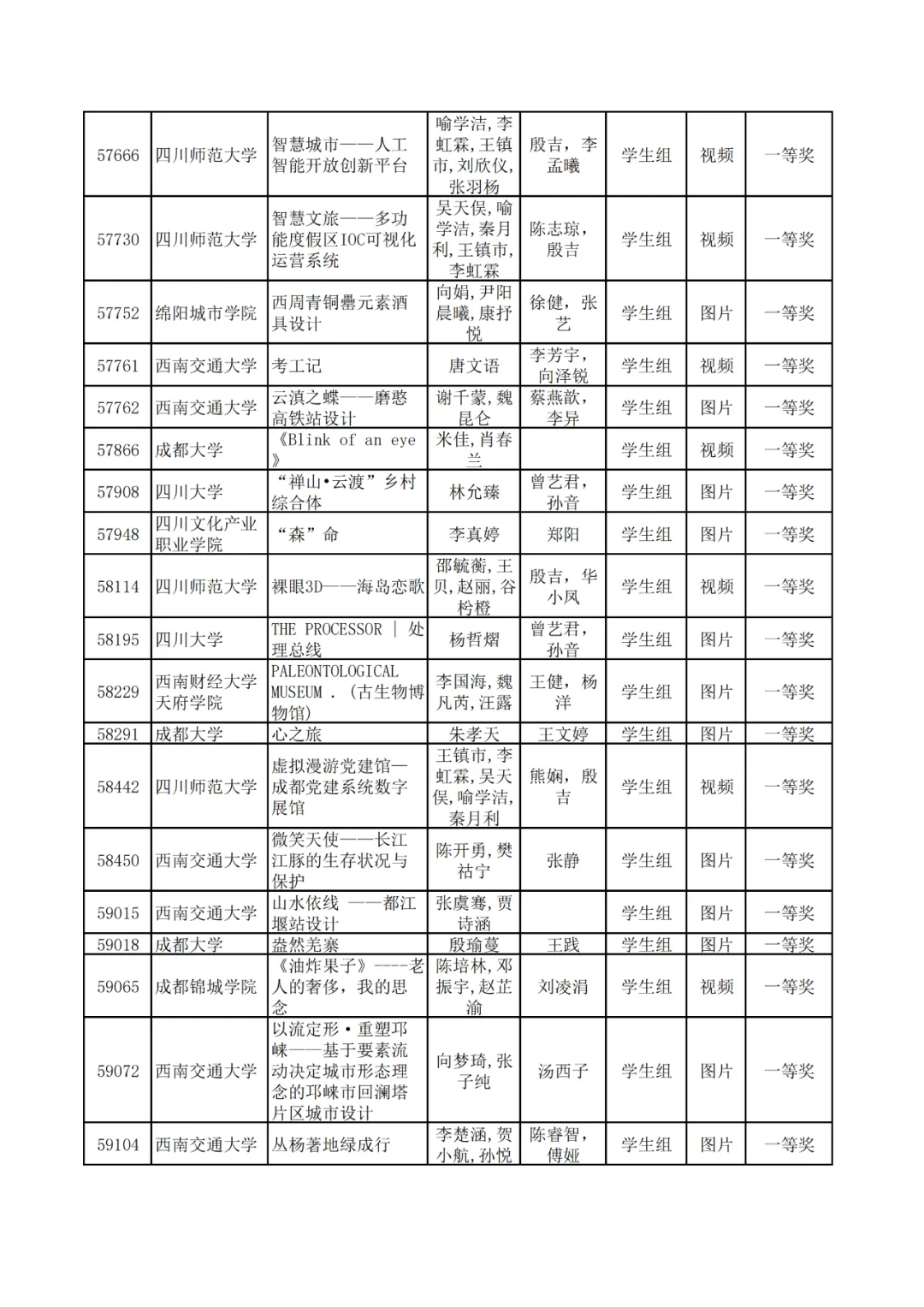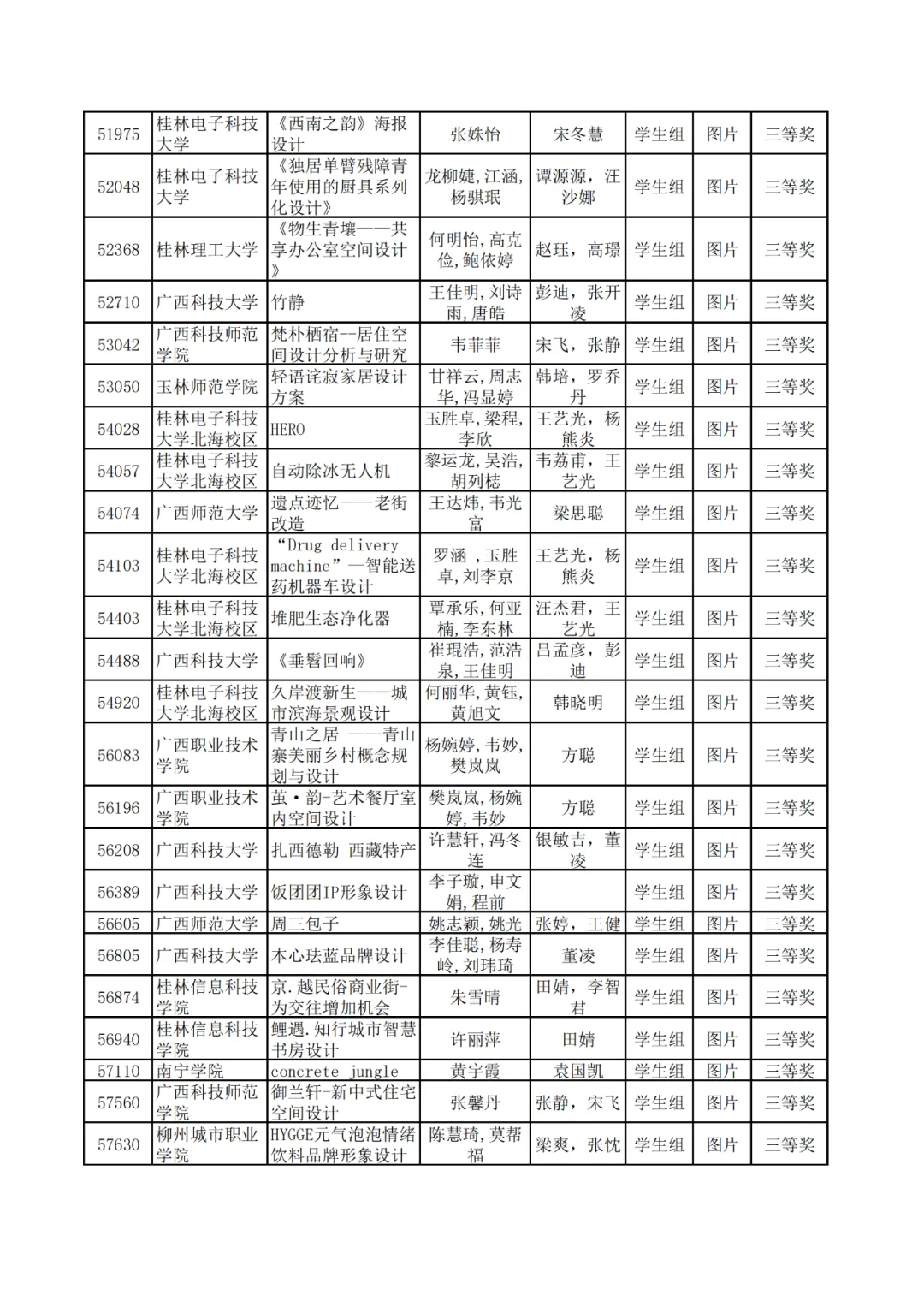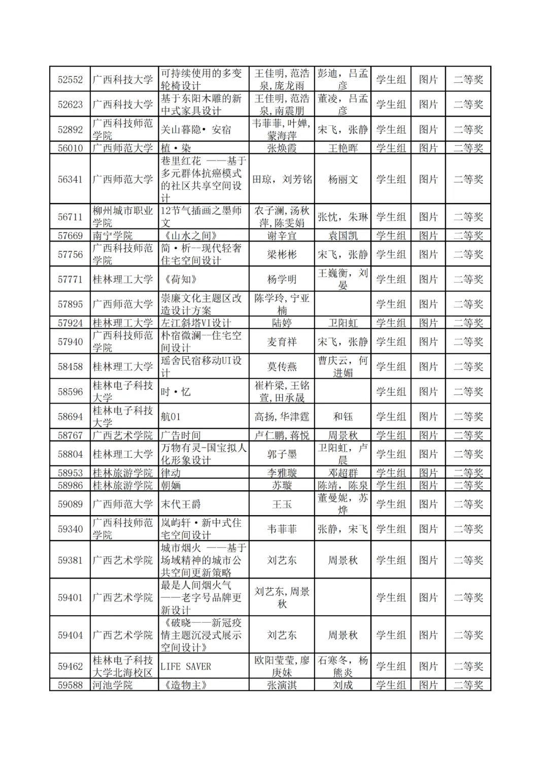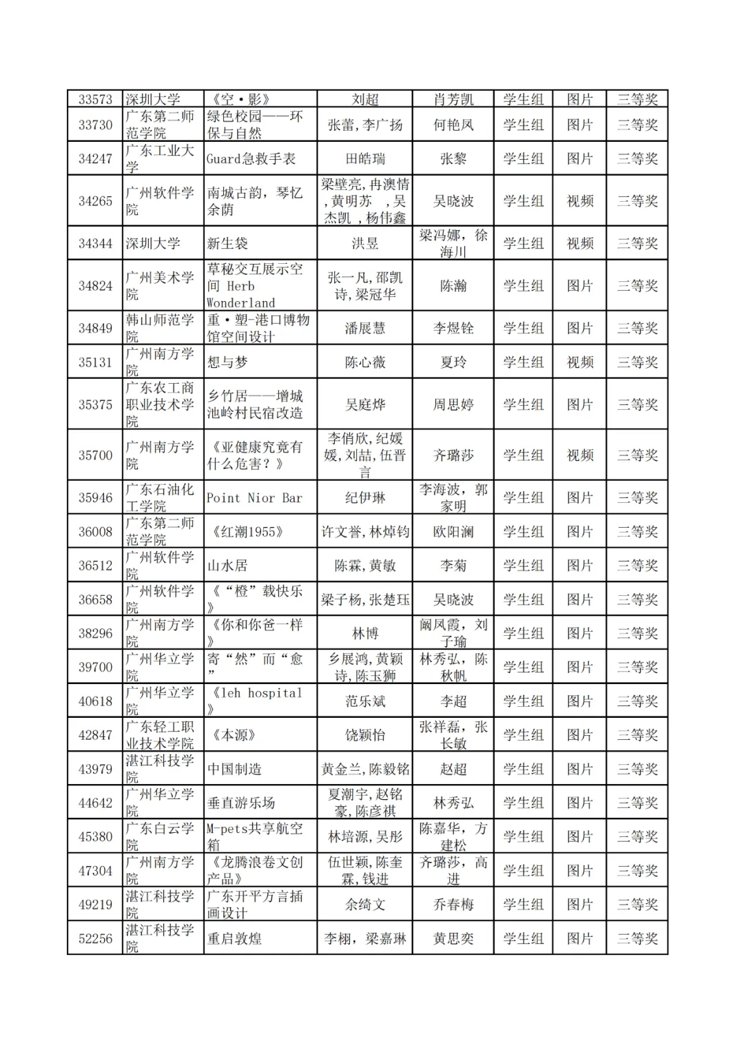 学生组获奖作品表。