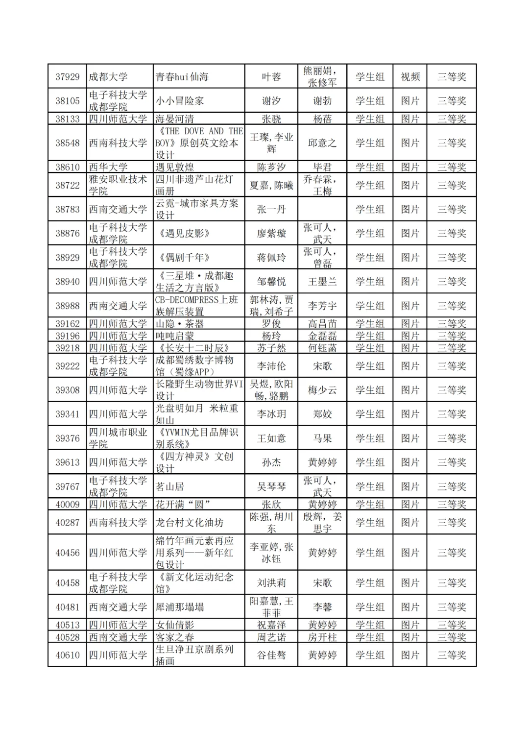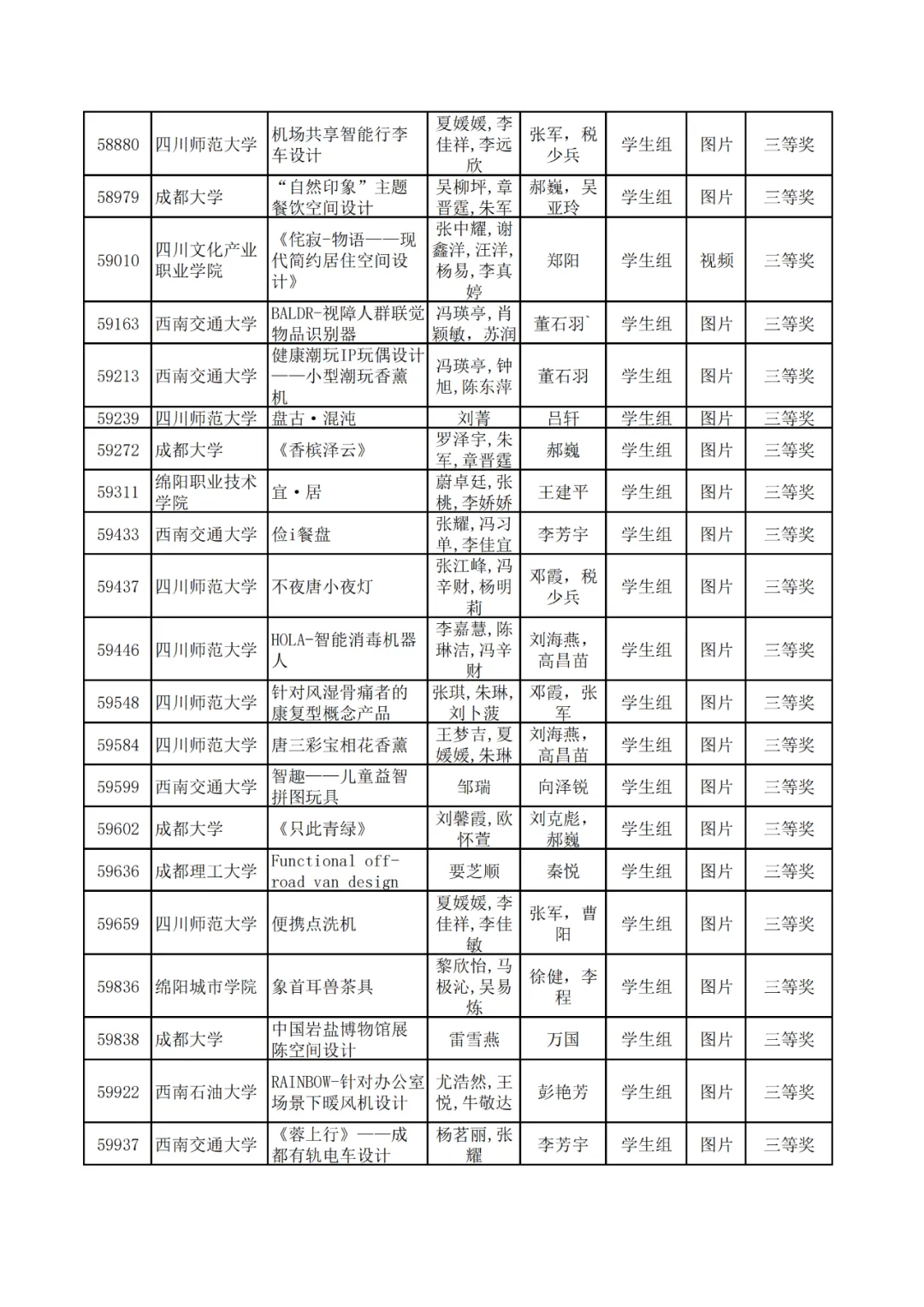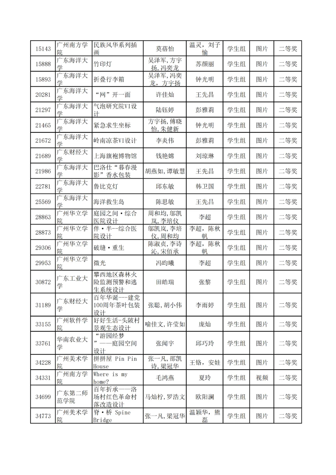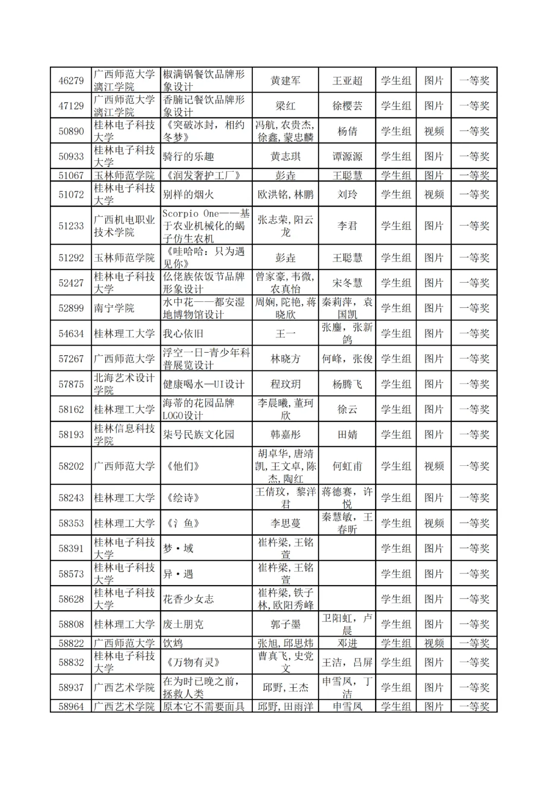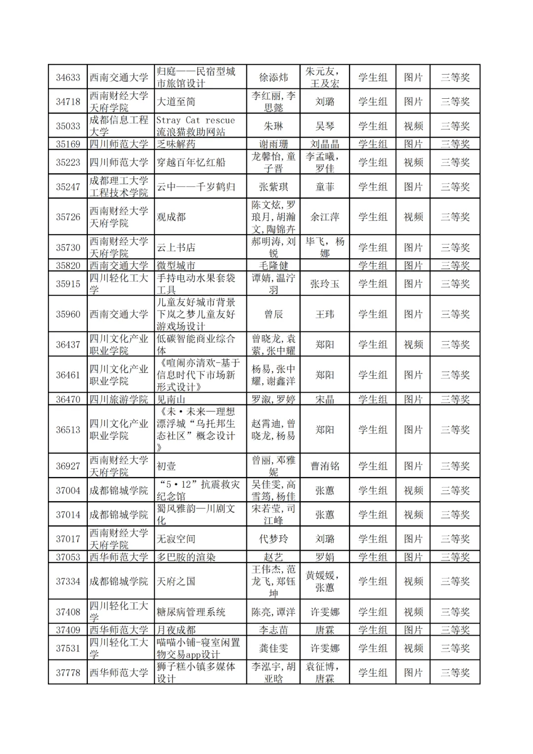 学生组获奖作品表。