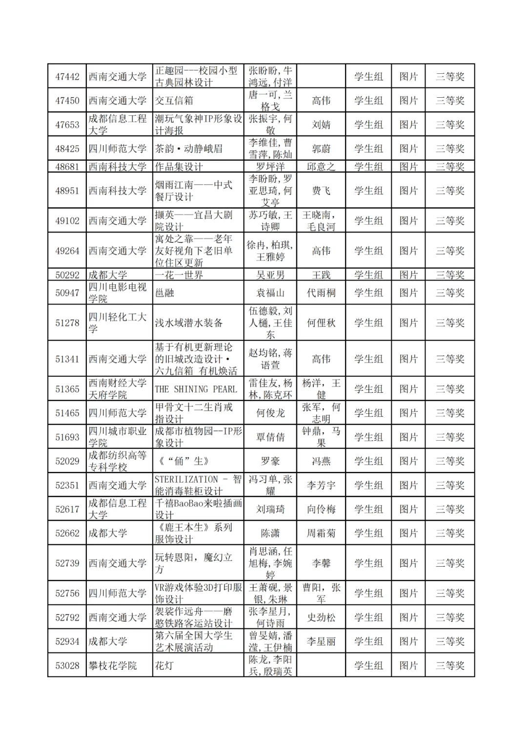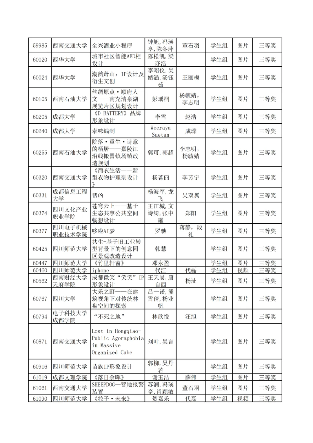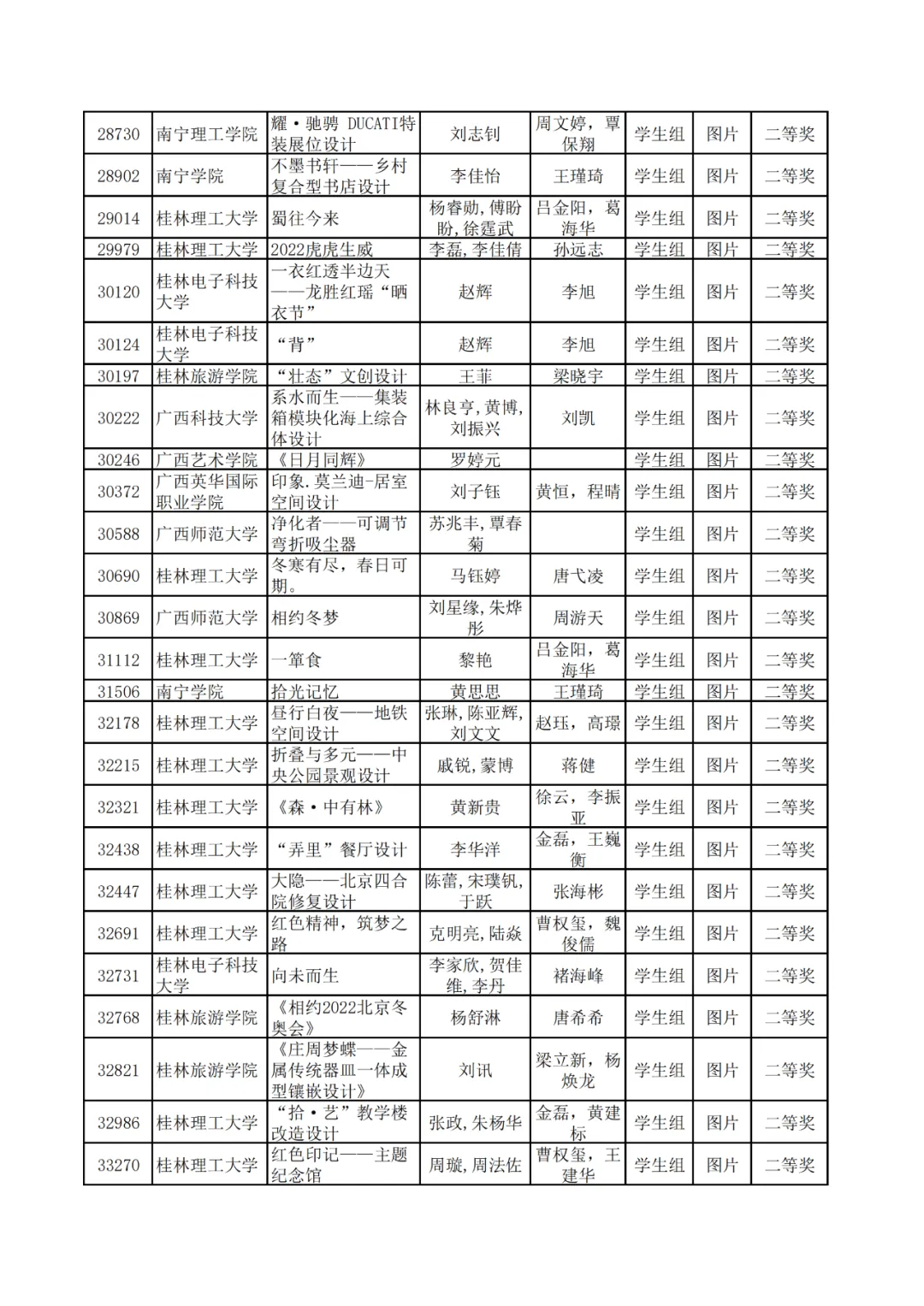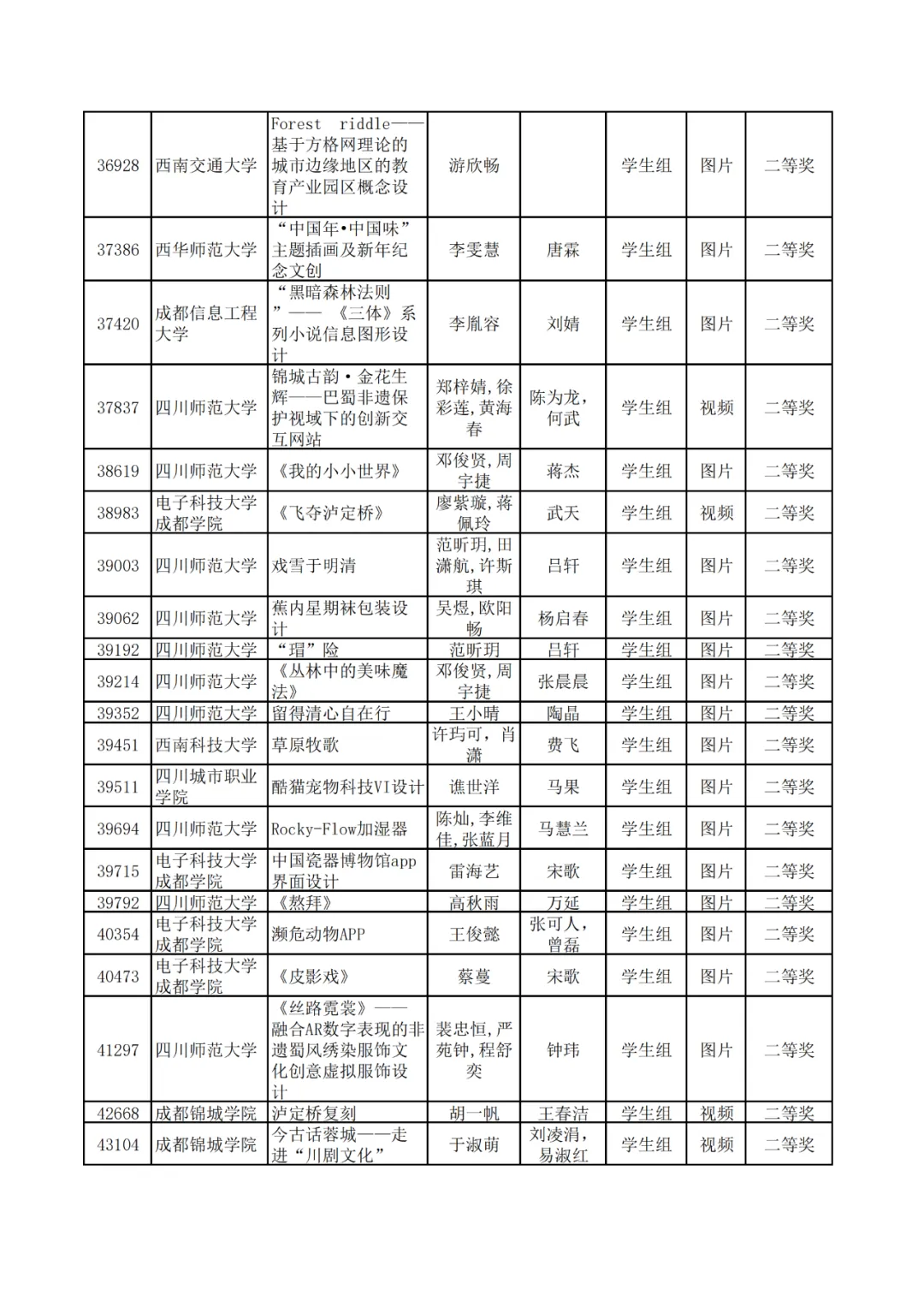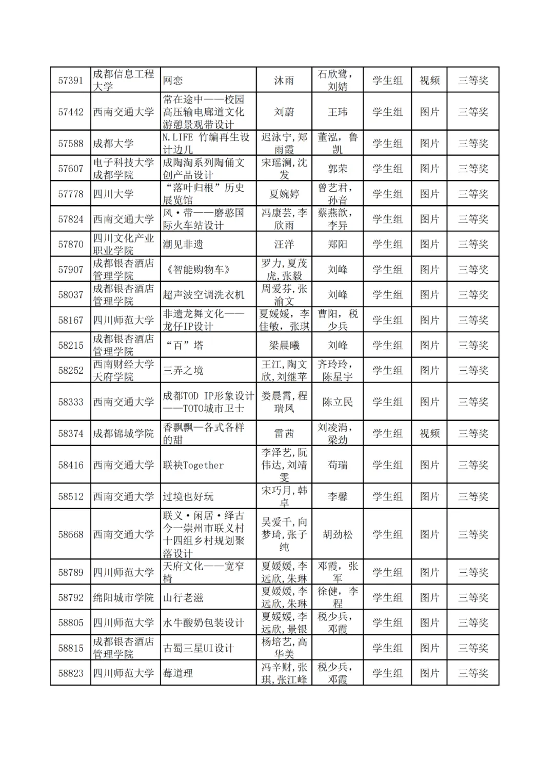 学生组获奖作品表。
