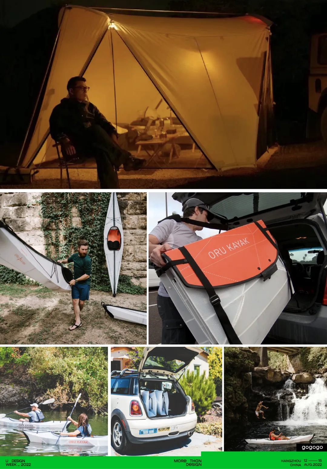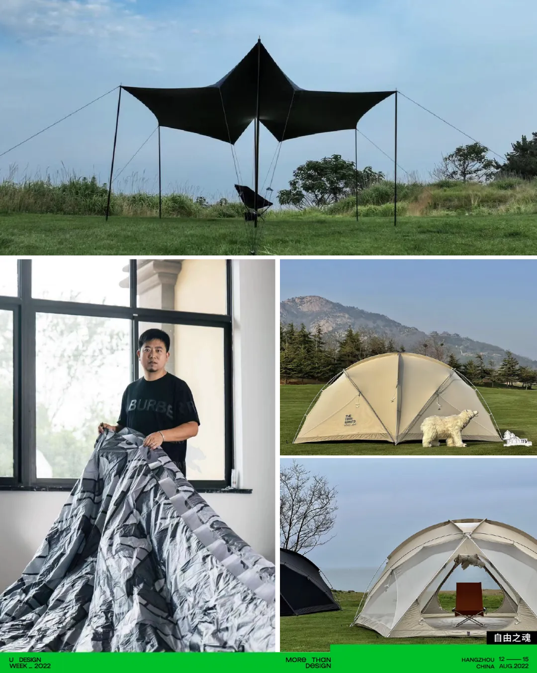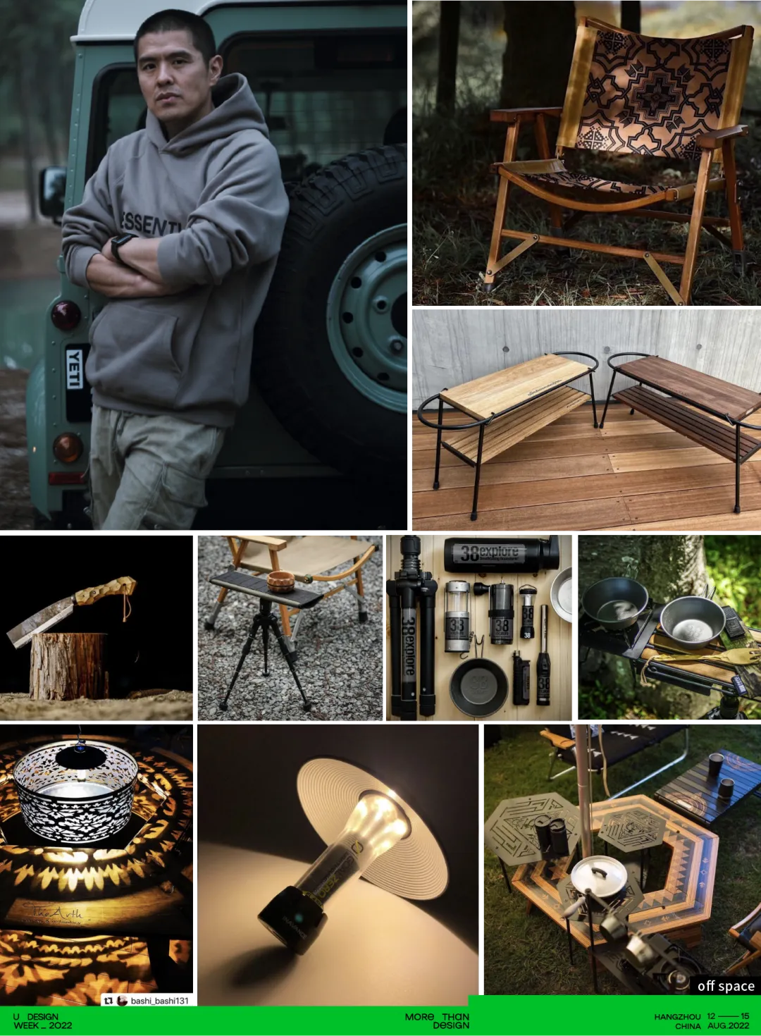 以倡导环保无痕露营的生活方式,从美学和原创设计出发。本次U设计周我们邀请了露营生活倡导者房凯作为联合策展人,BC露营达人著名空间设计师张健作为美学指导,集结国内最具代表性的原创设计师露营品牌和露营生活周边品牌及手工艺术家。邀请到OFF SPACE、什良商店、NATURAL HOTEL、自由之魂、Outdoor Yogui、Gogogo、一纳夫皮革研究所、黟舍、mifa、阿南纸艺、三风等众多露营品牌参与到其中。给大家带来一个不一样的露营生活美学展。