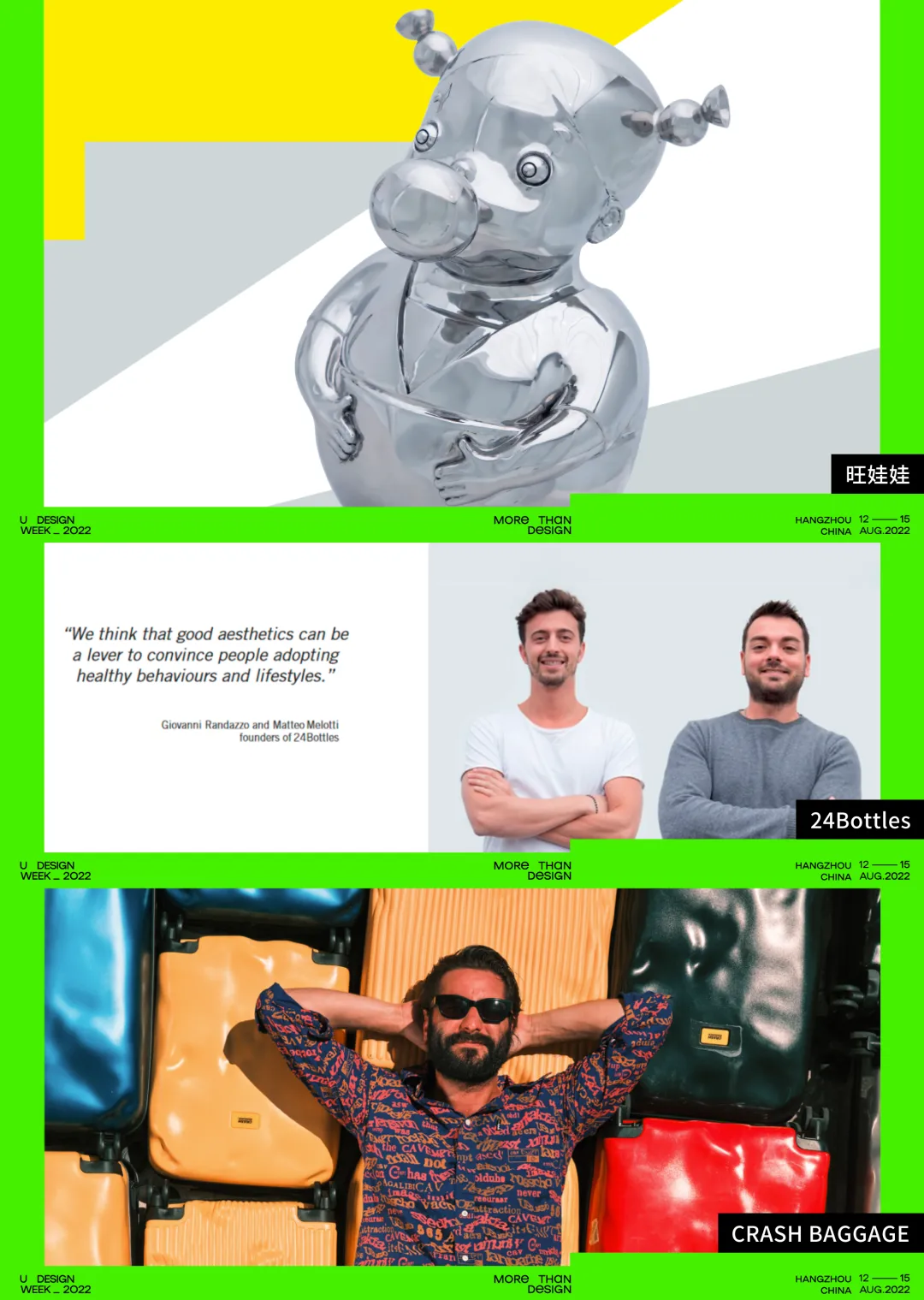 小红书带来产品设计部旗下两个自孵化品牌,杂志书《about关于》和IP衍生品REDclub。汪正虹带来旺娃娃,希望作品能够跟人们产生更直接的互动,感受娃娃的重量,与不可打倒的力量感。由夏嘉欢领衔的1SHOS品牌,和设计师Jhin共同带来六千双超越想象的人工智能鞋履,每一双鞋履都是独一无二的、由人工智能与艺术家协同创作,设计元素横跨中国风、赛博朋克、宇宙星空,为AI艺术潮流开创先河。与兰博基尼合作24 Bottles,带来了特别版作品。本次U设计周与CrashBaggage强强联合,推出「Ucan x CrashBaggage跨界新创意」主题合作场。