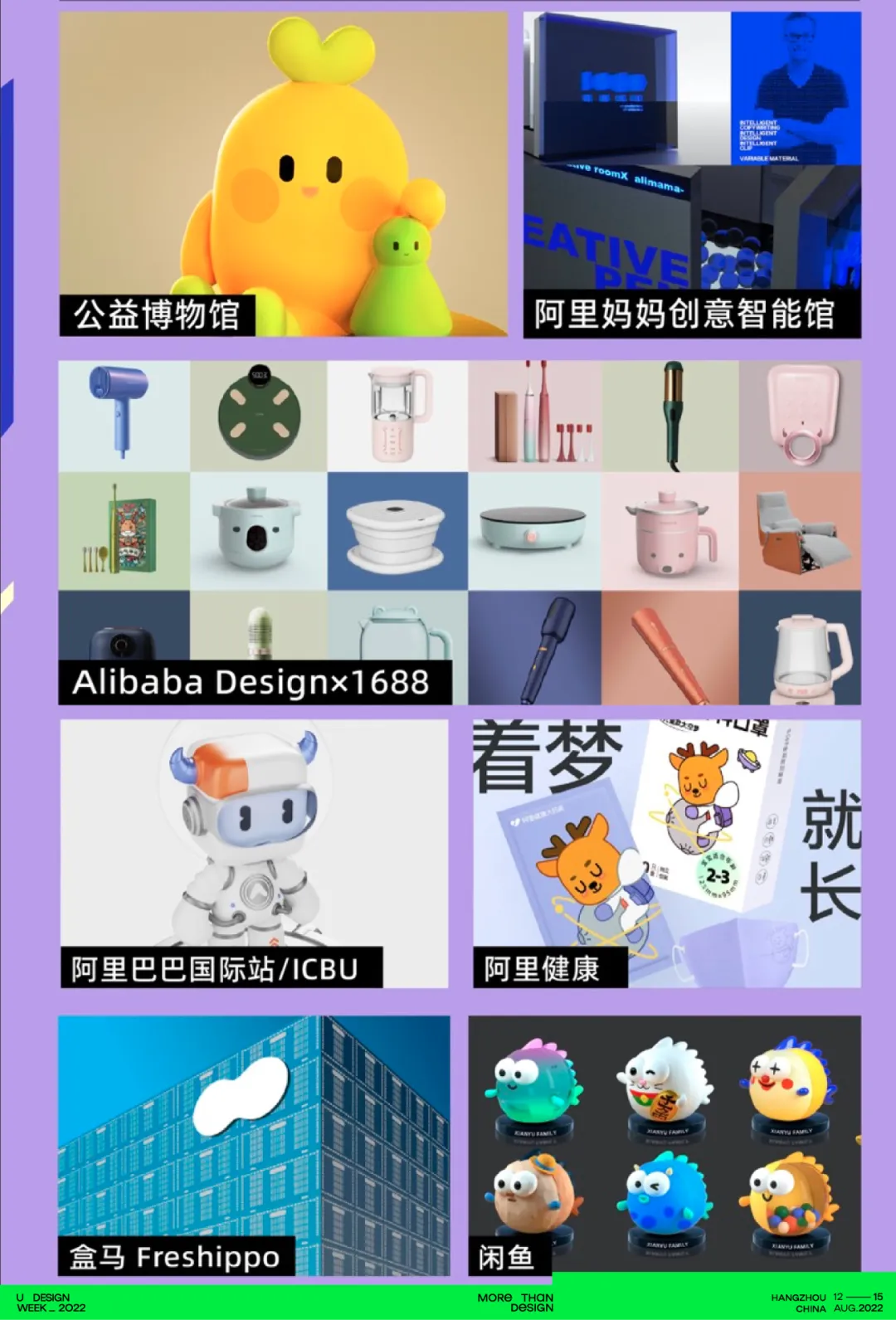 科技生态公益板块,将分为“设计工具”和“设计生态”2大科技内容矩阵。联合先锋公益设计展和阿里巴巴生态BU展,届时阿里妈妈创意智能馆、Alibaba Design✖️1688、阿里健康、阿里巴巴国际站/ICBU、盒马Freshippo、闲鱼等阿里生态为大家呈现不一样的科技生态公益展览。