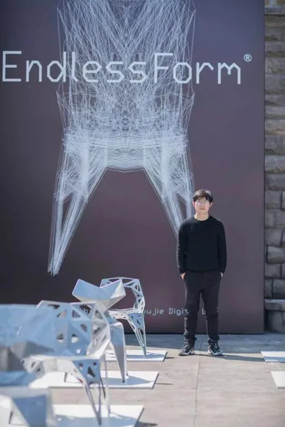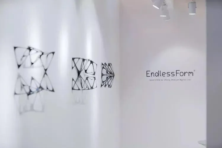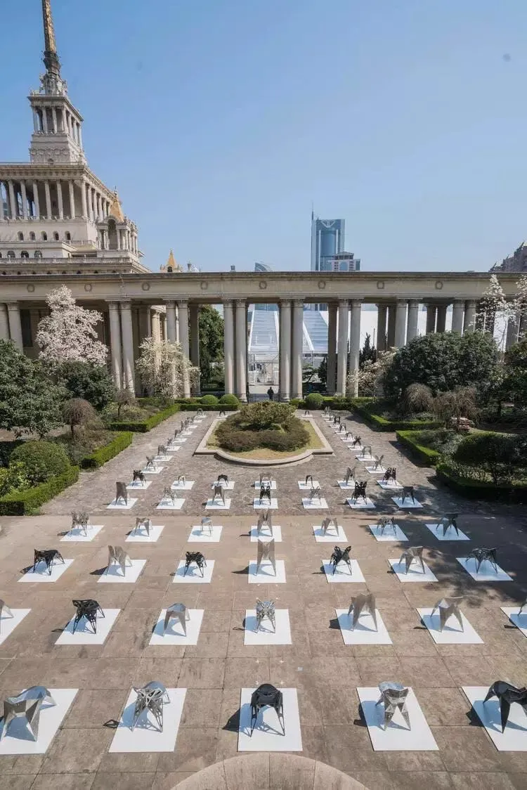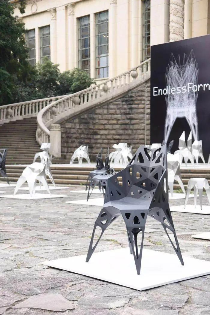 端着一杯茶步入展厅之间的户外中可以算是看展间隙的中场休息了。100把形态各异的金属椅子在这里列着方阵,特异之处在它们的设计师是计算机。来自先锋数字艺术团队Zhang Zhoujie Digital Lab推出的全新设计品牌Endless Form。