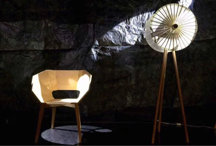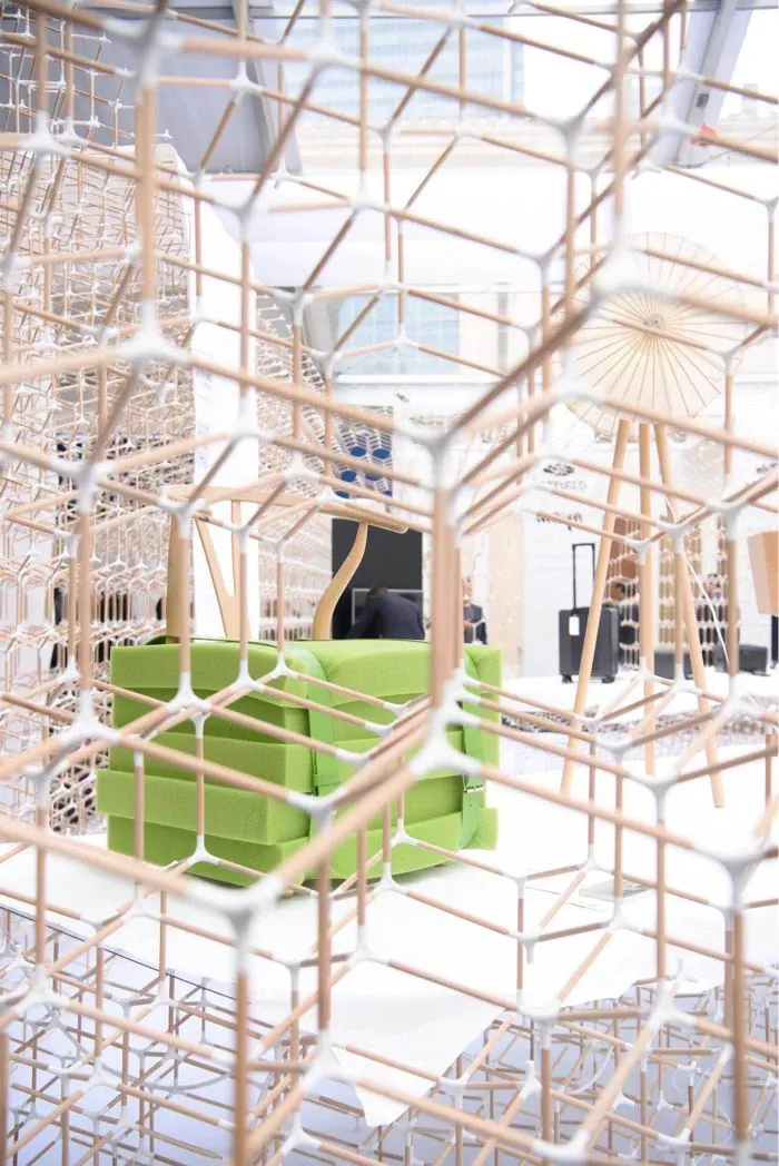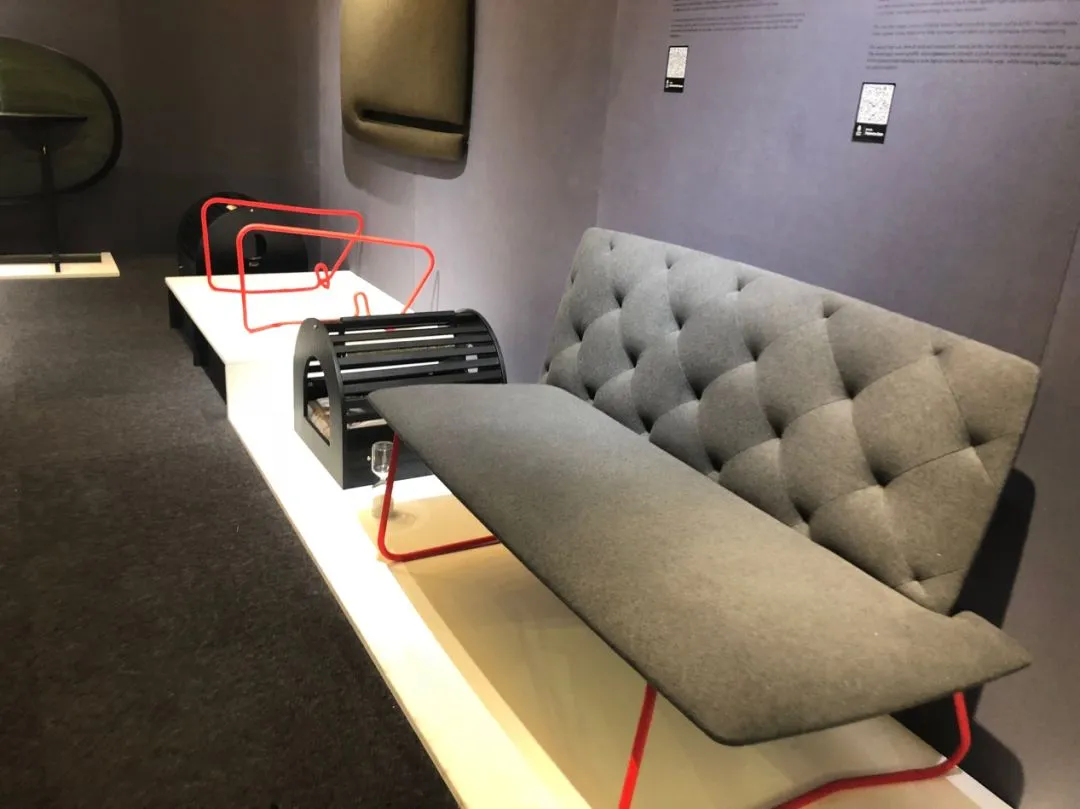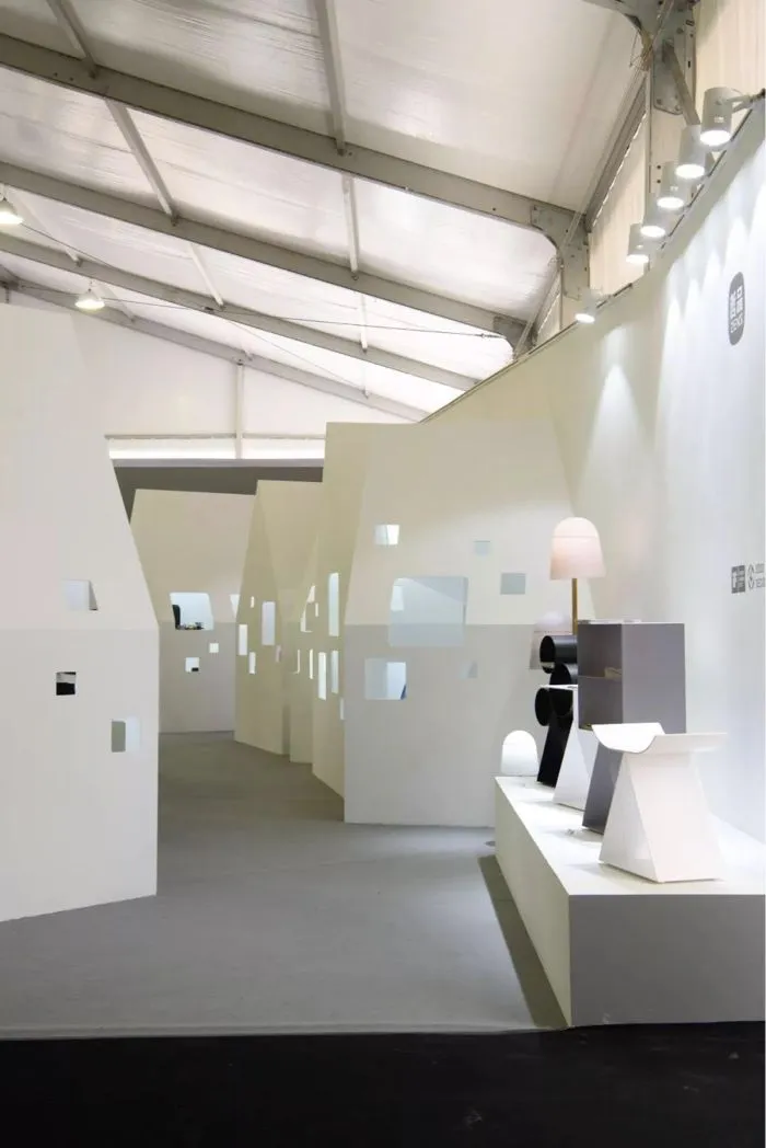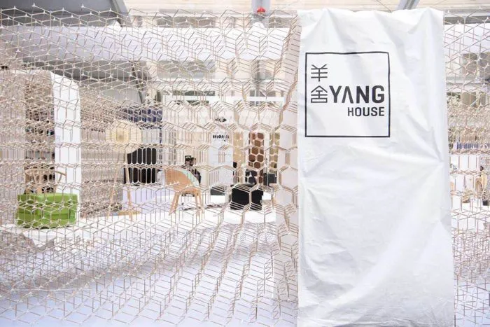 被四面白色Y型架包围的羊舍,应该是户外展区中最醒目的一角了。外围的支架就像乐高积木一样可以自由组合、不断变化、无限生长。完全不隔离视线的围栏,围起了一个缓慢的时空。百褶的折纸沙发、从古代条凳进化而来的“板凳上的风景”、纸伞一样的落地灯……仿佛都在暗示着生活应该慢一点,再慢一点。羊舍里虽然没有一只羊,但也值得欣赏。