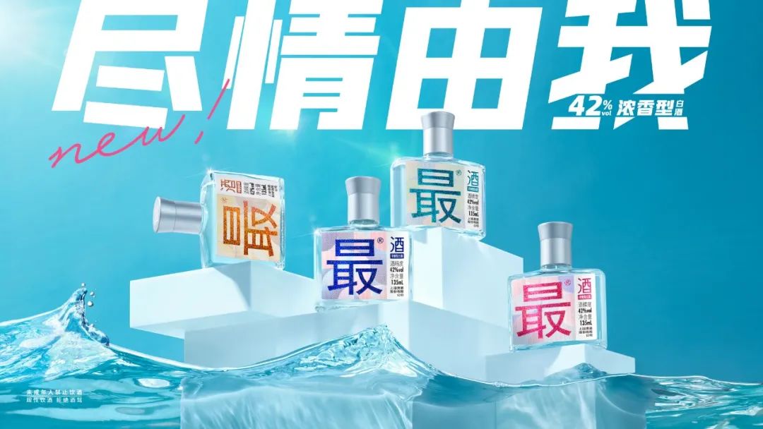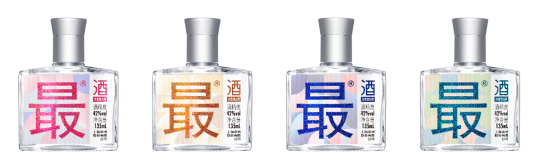 上海贵酒·最®酒最大的特色就在设计上。“最”字大字招牌站位,代表了对产品的超高追求与信念。全新时尚的排版结合正弧形的瓶型,搭载小巧便捷的135mL小容量,传递出一种“理性饮酒、尽情由我”的生活态度。并且一款多色,凭借吸引眼球的多重色彩,留出组合配色下潮流感的空间。