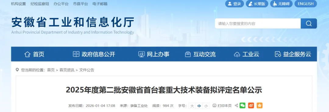 近日,安徽省工业和信息化厅依据省政府相关政策,组织完成了2025年度第二批安徽省首台套重大技术装备的评定工作。