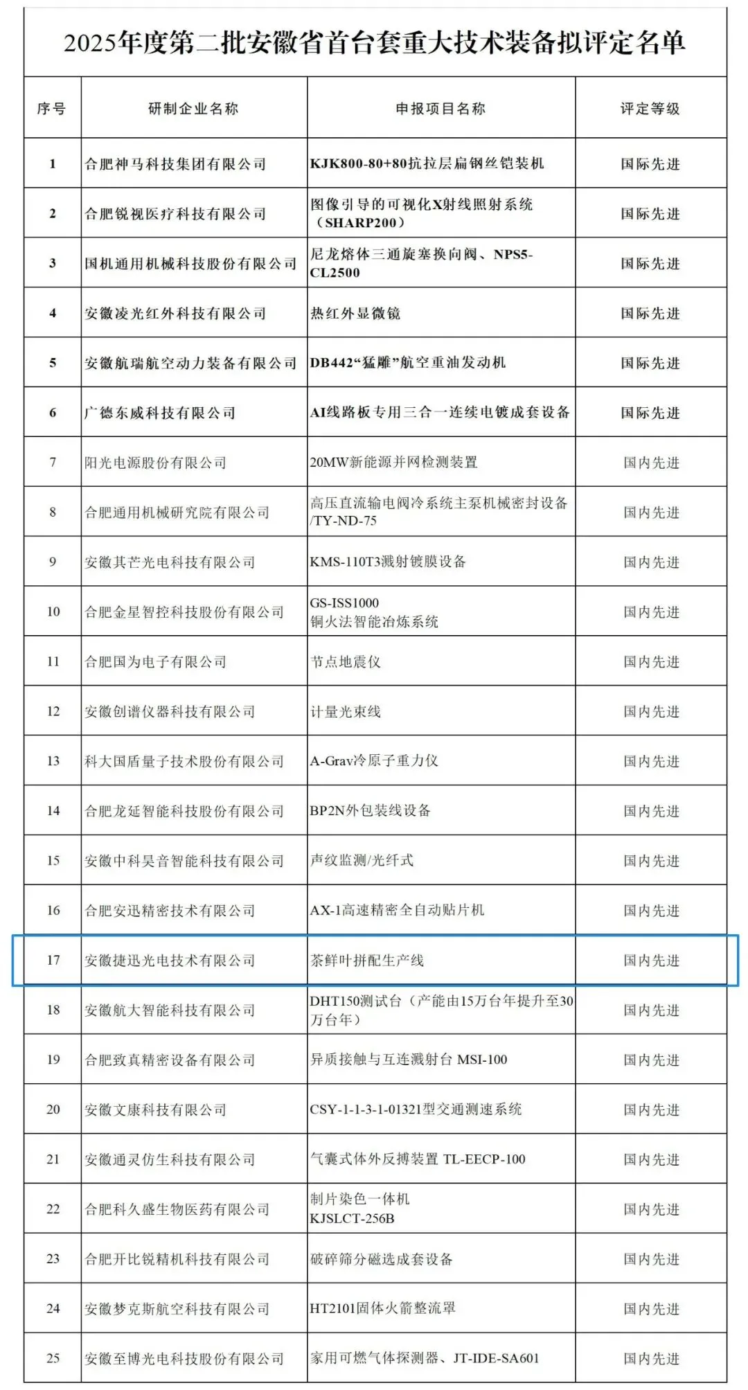 经过规范严谨的评审流程,共73项装备拟被评定为安徽省首台套重大技术装备。其中,安徽捷迅光电技术有限公司研制的“茶鲜叶拼配生产线”成功入选。(拓展阅读?硬核实力!捷迅这项技术走在前列!)