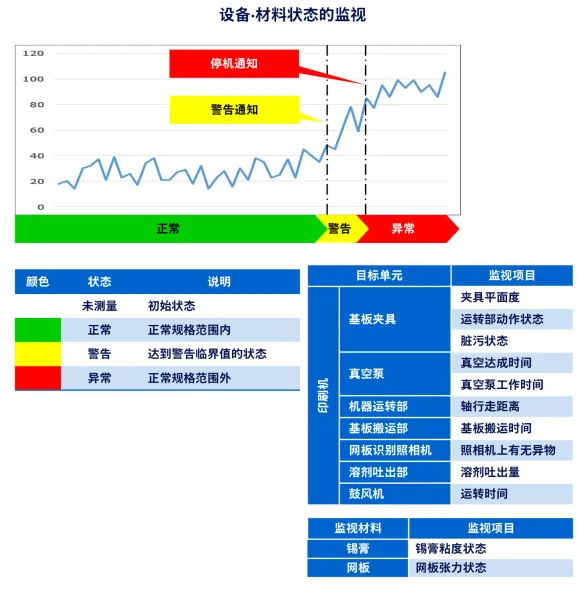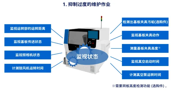 例如,系统会实时监视传送时间,捕捉基板到达时间的变化,并提示进行传送带的清洁。此外,系统还会实时监视基板侧面夹具的动作、基板吸附时的真空到达时间、以及基板侧面夹具上的异物附着等情况,并发出保养通知。