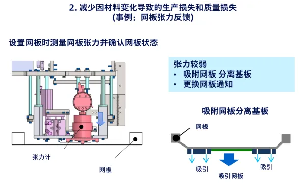 例如,“网板张力反馈”功能会在印刷前测量网板张力,当张力较弱时,系统会自动变更脱板动作,或发出更换网板的通知。