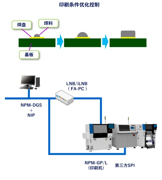 锡膏体积的补正数据会经由FA电脑(LNB)反馈至印刷机。