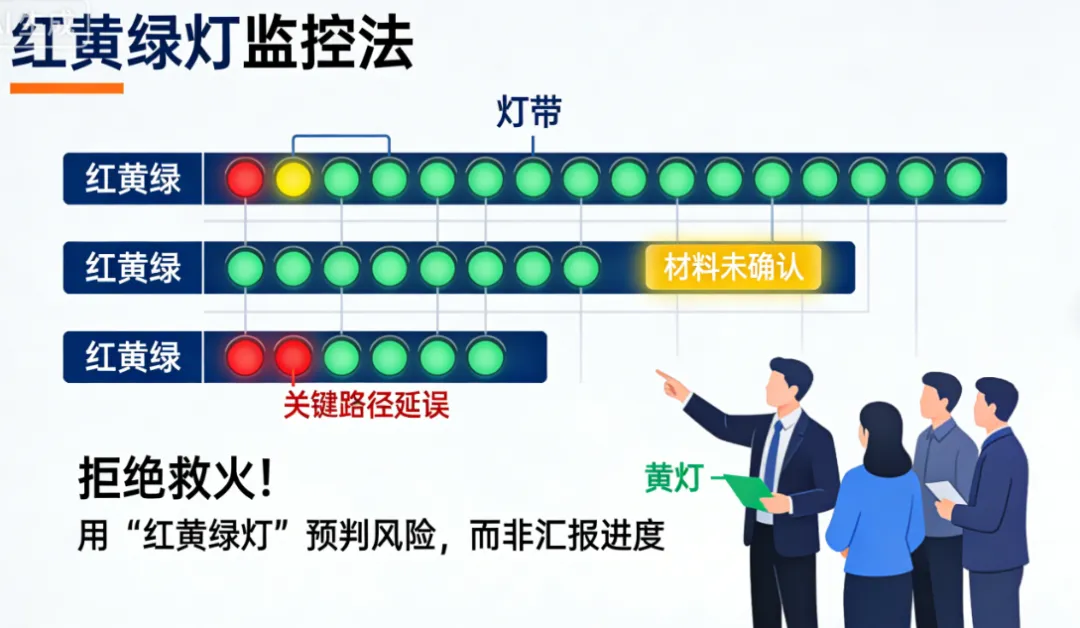 2. 用“红黄绿灯”进行主动监控建立双周项目审查会,但会议焦点不是听汇报,而是识别风险。使用一个简单的“红黄绿灯”看板: