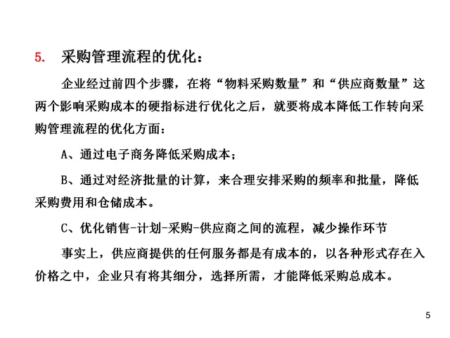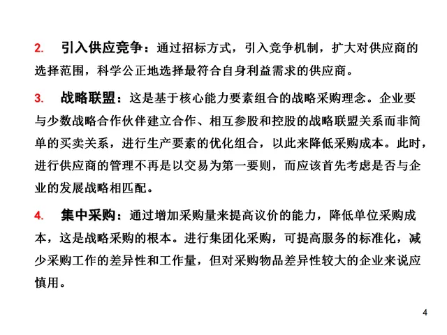 集中采购:通过增加采购量来提高议价的能力,降低单位采购成本,这是战略采购的根本。进行集团化采购,可提高服务的标准化,减少采购工作的差异性和工作量,但对采购物品差异性较大的企业来说应慎用。
