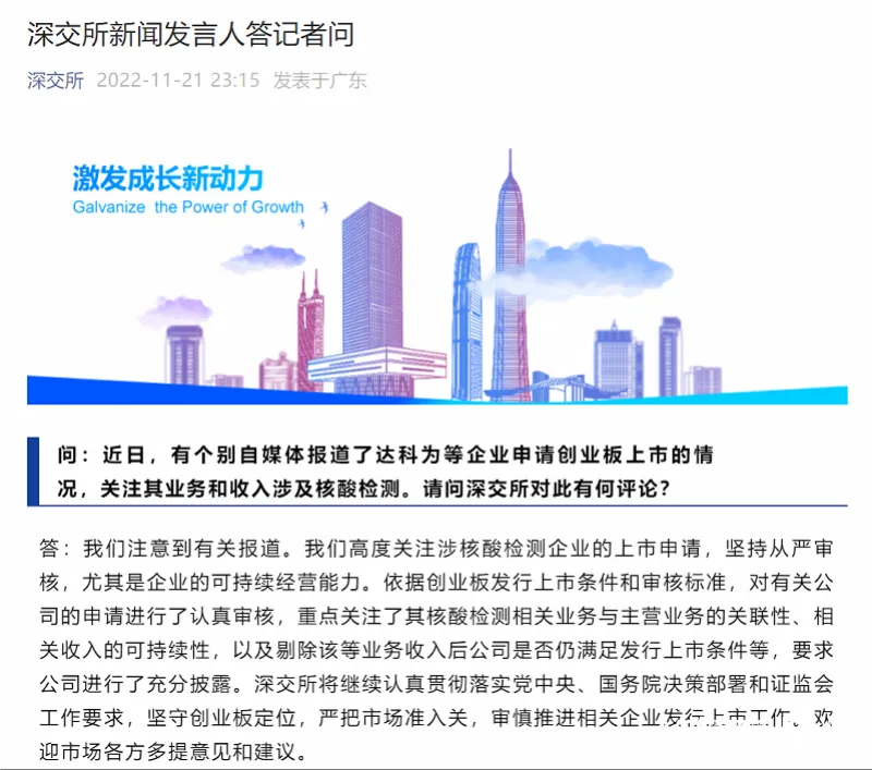 11月21日,沪深交易所就个别自媒体报道了部分拟上市公司其业务和收入涉及核酸检测等相关话题回答记者问。沪深交易所均表示,已经注意到有关报道,并高度关注涉核酸检测企业的上市申请,坚持从严审核。
