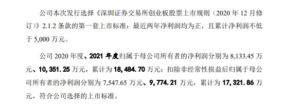 公司提到,2020年度、2021年度归属于母公司所有者的净利润分别为 8133.45万元、10351.25万元,累计为18484.70万元;扣除非经常性损益后归属于母公司所有者的净利润分别为7547.65万元、9774.21万元,累计为17321.86万元,符合公司选择的上市标准。