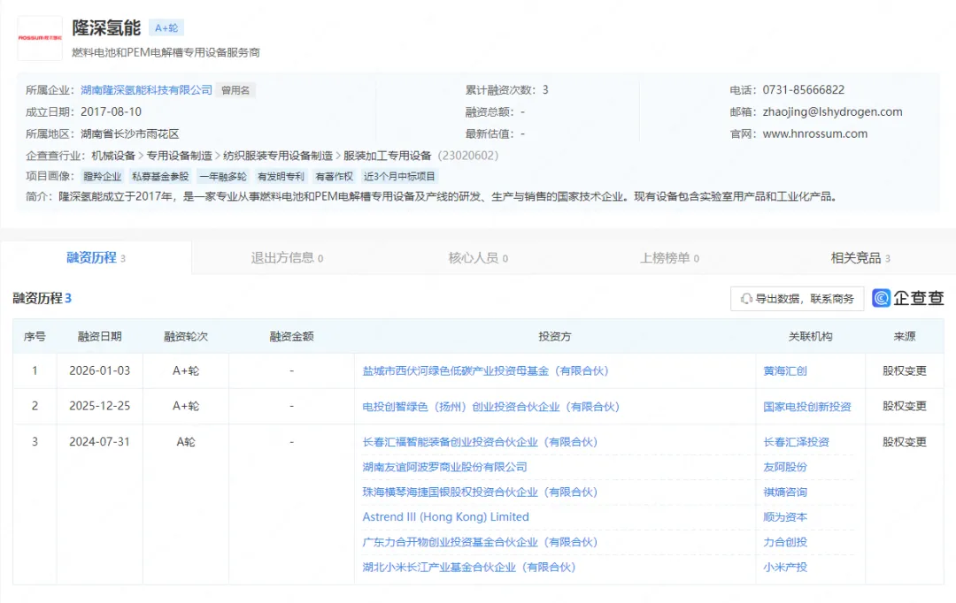 2026年1月3日,湖南隆深氢能完成 A+ 轮融资,投资方为黄海汇创,完成本轮融资后,黄海汇创将持有隆深氢能 5% 的股权。值得关注的是,这是该公司 10 天内的第二笔 A+ 轮融资。
