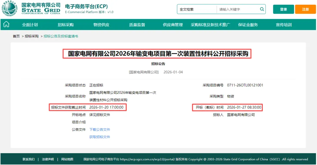 招标文件(电子文件)免费获取。凡有意参加投标者,请于2026年1月4日-2026年1月20日17:00时(北京时间,下同),登录招标人招投标交易平台信息系统(国家电网有限公司电子商务平台https://ecp.sgcc.com.cn,以下简称电子商务平台)获取招标文件,并按《电子招标投标办法》等国家法律法规要求,到第三方认证机构办理CA证书电子钥匙。投标人应妥善保管电子商务平台账号和密码,以及CA数字证书和密码,因上述账号、数字证书或密码保管不当造成的损失,由投标人自行承担。