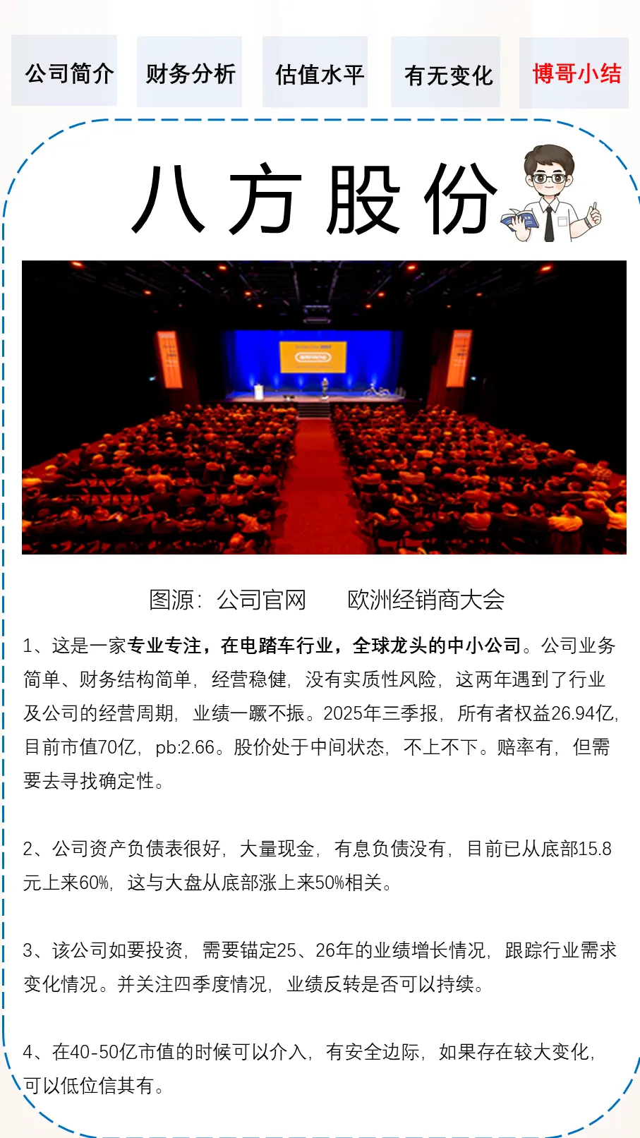 1️⃣ 电助力车全球龙头,有无影响公司价值重估的变化?2️⃣ 行业下游需求变化如何,是否存在困境反转的可能?3️⃣ 目前的估值如何?是否有介入的机会?
