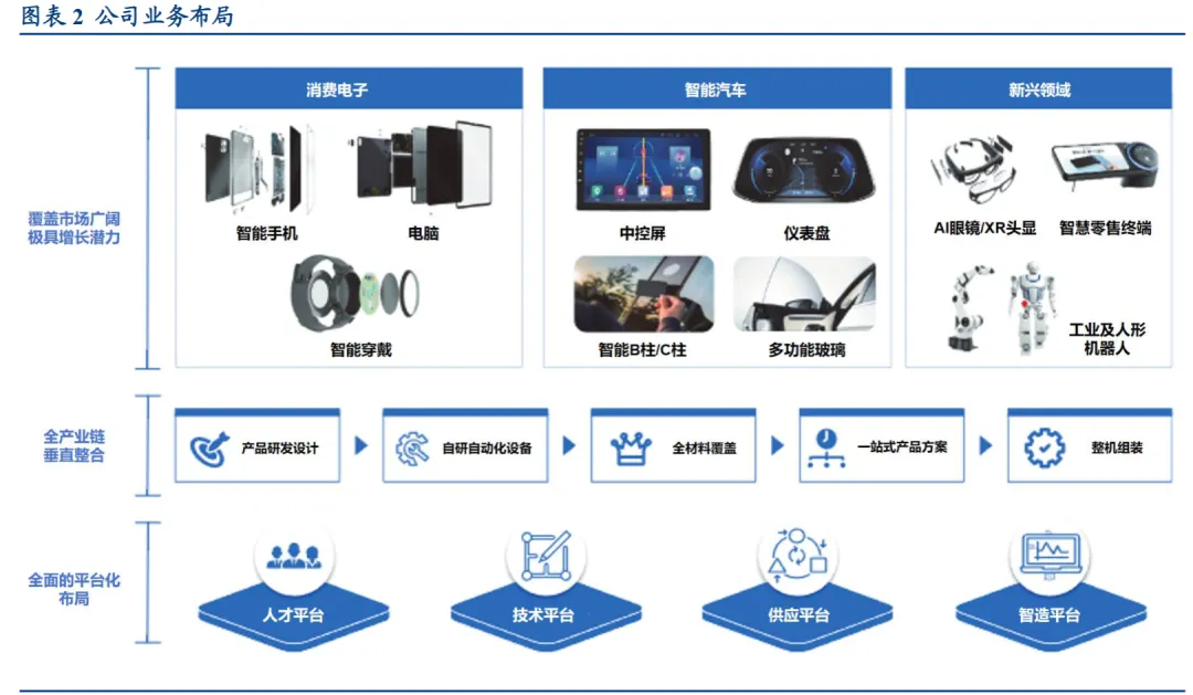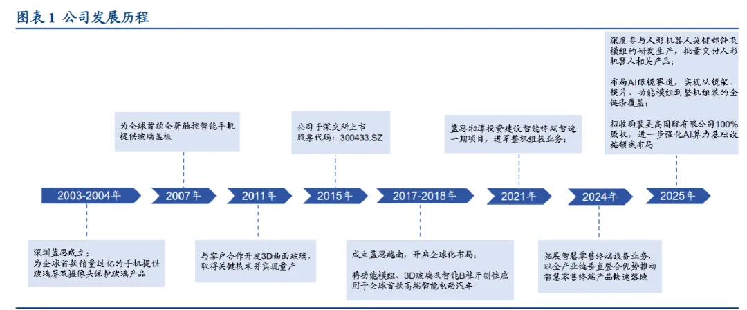 蓝思科技成立于2006年,2015年于深交所创业板上市,2025年在香港交易所上市,实现“A+H”双资本平台的战略布局。下游包括智能手机与电脑、智能汽车与座舱、智能头显与智能穿戴、人形机器人等领域,产品包括结构件、功能模组、整机组装等,涵盖玻璃、金属、陶瓷、塑胶、玻纤、碳纤维等材料。消费电子:为智能手机、电脑、智能穿戴等消费电子产品提供盖板玻璃、金属中框、触控模组、显示模组、散热模组、射频天线、生物识别、无线充电等结构件和功能模组产品,以及整机组装。智能汽车:围绕智能驾驶舱研发及生产多样化的汽车电子和结构件产品,为客户提供创新的解决方案,包括中控屏和仪表盘等车载电子玻璃及组件、智能B柱/C柱、应用于车窗、挡风及天幕的多功能玻璃等。其他新兴智能终端领域:公司已在人形机器人、AI眼镜/XR头显及智慧零售等多个领域布局。截至公司2025年三季报,公司前十大股东合计持有公司73.35%股份。公司实际控制人周群飞女士与其丈夫郑俊龙(一致行动人)通过蓝思科技(香港)有限公司和长沙群欣投资咨询有限公司间接持有公司58.52%股份。2025年前三季度公司实现营收536.63亿元,同比增长16.08%;2025年前三季度公司实现归母净利润28.43亿元,同比增长19.91%,公司2025年前三季度盈利能力已接近23年全年水平。2023-2024年公司智能手机与电脑类业务收入占比均超过80%,为公司主要收入来源。2024年公司智能手机与电脑类业务实现收入577.54亿元,同比增长28.63%,公司在玻璃、陶瓷、蓝宝石、金属等外观件、结构件和功能模组领域稳居领先地位。2022-2025年前三季度,公司净利率稳定在5%左右。公司不断提升企业管理和运营效率,期间费用率呈下降趋势,期间四费占营收的比重从2019年的15.16%波动下降至2024年的8.97%。公司持续加强研发投入,研发费用不断突破新高,2024全年累计研发投入27.85亿元,同比增长20.2%。据IDC数据,2024年全球智能手机出货量12.4亿台(YoY+5.98%),随着AI大模型在端侧加速应用,智能手机市场在经历了波动后重新回暖。中国市场方面,2024年中国智能手机出货量2.86亿部(YoY+5.54%),复苏趋势显著。据Canalys数据,2024年全球折叠屏手机出货量1530万部,预计2027年将达3140万部,2024-2027年CAGR达27.08%。根据IDC数据预测,中国市场2024年折叠屏手机出货量1070万部,预计2027年将达1650万部,2024-2027CAGR达15.53%,期间中国市场占比有望保持在50%以上。2025年第三季度全球智能眼镜市场出货量429.6万台,同比增长74.1%。其中全球音频和音频拍摄眼镜市场出货量299.4万台,同比增长287.5%。Meta推出Ray-Ban Meta二代、Oakley运动线及MetaDisplay新品,市场份额达到75.7%,稳居主导地位。根据IEA国际能源署、EVTank联合伊维经济研究院和中国汽车工业协会数据统计,2024年全球/中国新能源汽车销量分别达到1823.6/1286.6万辆,2018~2024年全球/中国新能源汽车销量复合增长率分别达43.78%/47.37%。同时,EVTank预测2025年全球新能源汽车销量将达到2239.70万辆,其中中国市场将达到1649.70万辆,2030年全球新能源汽车销量有望达到4405.00万辆。根据Frost & Sullivan统计和预测,全球智能汽车交互系统市场规模从2020年的19亿美元增长到2024年的40亿美元,并预计于2029年达到93亿美元,2025至2029年复合年增长率为18.2%。同时,随着用户对汽车智能交互体验的需求不断提高,预期2029年中控屏、智能仪表盘、HUD、流媒体后视镜和智能B柱的渗透率将分别达到98.5%、65.0%、50.0%、25.0%和29.0%。蓝思科技早在2018年就已开始布局汽车领域,凭借在电子玻璃后道加工领域数十年的积累,公司充分发挥在玻璃减薄、化学强化、多层镀膜和高精度加工的技术优势,在车载玻璃的减重和多功能性方面具有显著优势。公司研发的汽车玻璃具备轻量化、隔音、隔热、隔紫外线、防水、防污、HUD投射以及变色遮光等功能,可广泛应用在汽车车窗、挡风玻璃及天幕玻璃。全球智能机器人市场规模从2020年的320亿美元增长至2024年的602亿美元,复合年增长率为17.1%,预计到2029年将达到1,239亿美元。人形机器人作为服务机器人中的重要领域,近年来备受关注,预计其市场规模从2025年23亿美元增长至2029年129亿美元,复合年增长率为54.4%。蓝思科技自2016年起布局智能机器人领域,以自有资金设立智能机器人子公司,自主研发六轴机器人、AOI视觉检测机器人等工业机器人,并逐步拓展至人形机器人核心部件研发。2025年1月蓝思科技与智元机器人联合交付全球首款全栈开源机器人灵犀X1,助力智元实现2024年产超千台机器人目标。除整机组装之外,蓝思科技还将成为越疆机器人主要部件供应商,涵盖关节电机、结构件及其他核心部件的开发、量产与供应,形成“研发-制造-供应”闭环。2025年12月,蓝思科技拟收购裴美高国际有限公司100%股权,进而获得旗下元拾科技95.116%股权。通过本项收购,蓝思科技有望快速获得国内外特定客户服务器机柜业务的成熟技术与客户认证,与公司强大的精密结构件制造及“材料—模组—整机”垂直整合能力形成强力互补和高度协同,有望增强在AI算力硬件方案的核心竞争力。由于篇幅有限,可加入知识星球阅读研报原文,深入了解公司,知识星球内每天更新更多公司研报: