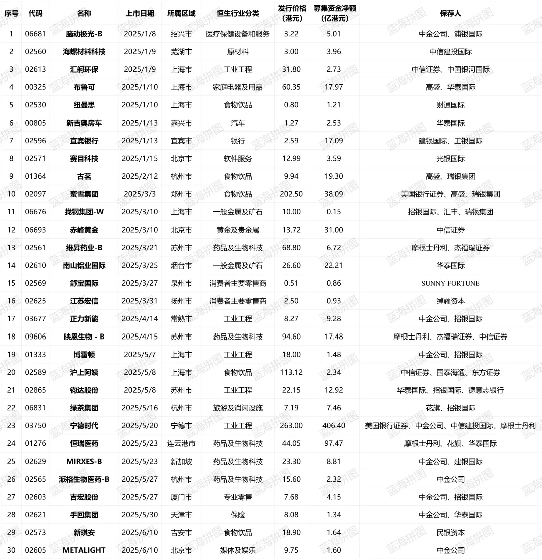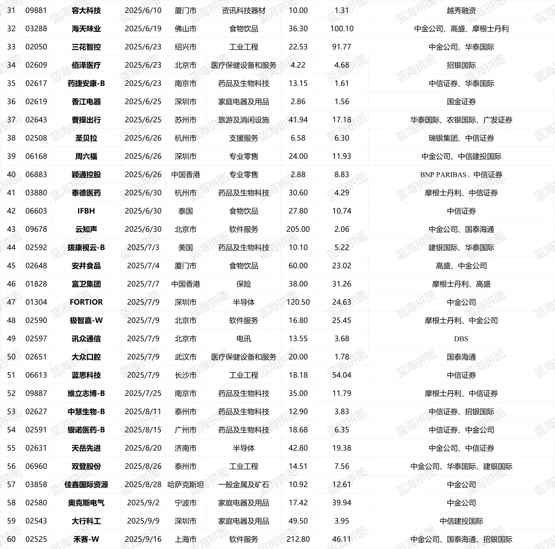 1. 脑动极光-B(06681):主要致力于在中国提供认知障碍数字疗法(‘数字疗法’)集成软件解决方案。2. 海螺材料科技(02560):从事研发、生产及销售水泥外加剂、混凝土外加剂及其各自的过程中间体(即醇胺产品、聚醚单体及聚羧酸母液)。3. 汇舸环保(02613):船舶与海洋领域环保装备的研发、设计、生产和销售服务。4. 布鲁可(00325):主要从事拼搭类玩具的设计、研发和销售。5. 纽曼思(02530):从事销售,包括营销、销售及分销营养品。6. 新吉奥房车(00805):从事制造及出口至澳洲的房车(‘房车’)以及通过澳洲及新西兰的经销商及门店销售房车。7. 宜宾银行(02596):公司的主要业务包括公司银行、零售银行及金融市场业务。8. 赛目科技(02571):主要从事ICV仿真测试产品的设计及研发并提供相关测试、验证和评价解决方案。9. 古茗(01364):集团主要从事加盟零售网络的经营及现制饮品原料及其他相关产品以及设备的贸易。10. 蜜雪集团(02097):从事商品和设备销售以及提供加盟和相关服务。11. 找钢集团-W(06676):主要从事提供钢铁贸易全价值链的一体化服务,包括线上钢铁商务、物流、仓储及加工服务以及供应链融资。12. 赤峰黄金(06693):黄金的采、选及销售业务。13. 维昇药业-B(02561):开发并商业化颠覆式内分泌疗法。14. 南山铝业国际(02610):氧化铝的生产及销售。15. 舒宝国际(02569):生产和销售一次性使用卫生用品及无纺布。16. 江苏宏信(02625):超市及便利店连锁运营商。17. 正力新能(03677):动力及储能电池制造商,提供电芯、模组、电池包、电池簇、电池管理系统的一体化方案。18. 映恩生物 - B(09606):集团主要从事新药的研发工作,致力于为癌症和自身免疫性疾病等患者研发ADC创新药物。19. 博雷顿(01333):主要从事设计、开发以新能源为动力的工程机械并使其商业化。20. 沪上阿姨(02589):一家快速增长的现制饮品公司。21. 钧达股份(02865):光伏电池片的研发、生产和销售。22. 绿茶集团(06831):在中国进行餐厅经营。23. 宁德时代(03750):动力电池、储能电池的研发、生产、销售。24. 恒瑞医药(01276):药品的研发、生产和销售25. MIRXES-B(02629):主要从事开发及商业化用于癌症及其他疾病早期检测的、精准的、无创的、可负担的、基于血液的miRNA检测试剂盒产品。26. 派格生物医药-B(02565):慢性疾病治疗领域创新药研发和生产。27. 吉宏股份(02603):包装业务的生产、设计和销售。28. 手回集团(02621):公司是一家中国人身险中介服务提供商,致力于通过人身险交易及服务平台,在线为投保人及被保险人提供保险服务解决方案。29. 新琪安(02573):主要从事食品级甘氨酸、工业级甘氨酸及三氯蔗糖的生产及销售。30. METALIGHT(02605):通过车来了APP提供移动广告服务及数据技术服务。31. 容大科技(09881):主要在中国从事制造及销售专门打印机、衡器、POS终端机及PDA设备以及提供相关解决方案。32. 海天味业(03288):调味品的生产和销售。33. 三花智控(02050):制冷空调电器零部件业务和汽车零部件业务。34. 佰泽医疗(02609):主要从事投资及提供医疗相关服务的肿瘤医疗集团。35. 药捷安康-B(02617):医药产品研发。36. 香江电器(02619):品质生活家居用品的研发、设计、生产与销售。37. 曹操出行(02643):主要从事于新能源网约车平台运营,提供一系列出行服务及其他服务以及销售汽车。38. 圣贝拉(02508):月子中心;家庭护理服务;食品。39. 周六福(06168):珠宝首饰研发设计、生产加工、连锁销售、品牌运营。40. 颖通控股(06883):主要从事香水、护肤品、彩妆、个人护理产品、眼镜及家居香氛的零售、批发及分销。41. 泰德医药(03880):为提供重大的合约研发生产机构(CRDMO)服务,专注合成多肽生产。42. IFBH(06603):主要从事即饮饮料及即食食品生产及销售。43. 云知声(09678):提供AI相关销售及服务。44. 拨康视云-B(02592):生物制剂研发。45. 安井食品(02648):速冻调制食品(以速冻鱼糜制品、速冻肉制品为主)、速冻菜肴制品和速冻面米制品等速冻食品的研发、生产和销售。46. 富卫集团(01828):是一家发展迅速、领先的泛亚洲人寿保险公司。47. FORTIOR(01304):电机驱动控制专用芯片的研发、设计与销售业务。48. 极智嘉-W(02590):主要业务为提供AMR解决方案的销售及RaaS。49. 讯众通信(02597):云通信平台服务(含短信、语音、移动流量及智能云联络服务),以及智能通信解决方案(以软件和软硬件结合的方式为客户提供行业应用及市政治理、安全监管等通信连接解决方案)。50. 大众口腔(02651):从事口腔医疗服务。51. 蓝思科技(06613):智能终端全产业链一站式精密制造解决方案提供商。52. 维立志博-B(09887):抗体新药的研究、开发及商业化。53. 中慧生物-B(02627):人用疫苗产品的研发、生产及商业化。54. 银诺医药-B(02591):主要从事医药产品的研发及商业化。55. 天岳先进(02631):碳化硅半导体材料的研发、生产和销售。56. 双登股份(06960):储能电池产品的研发、生产与销售。57. 佳鑫国际资源(03858):主要于哈萨克斯坦共和国从事勘探、开发及运营钨矿。58. 奥克斯电气(02580):从事家用空调及中央空调器的制造及销售。59. 大行科工(02543):制造及买卖大行自行车及相关产品,以及授予商标许可。60. 禾赛-W(02525):设计、开发、制造及销售先进的激光雷达产品。61. 健康160(02656):医药健康用品销售、提供数字医疗健康解决方案。62. 劲方医药-B(02595):公司为临床阶段生物科
