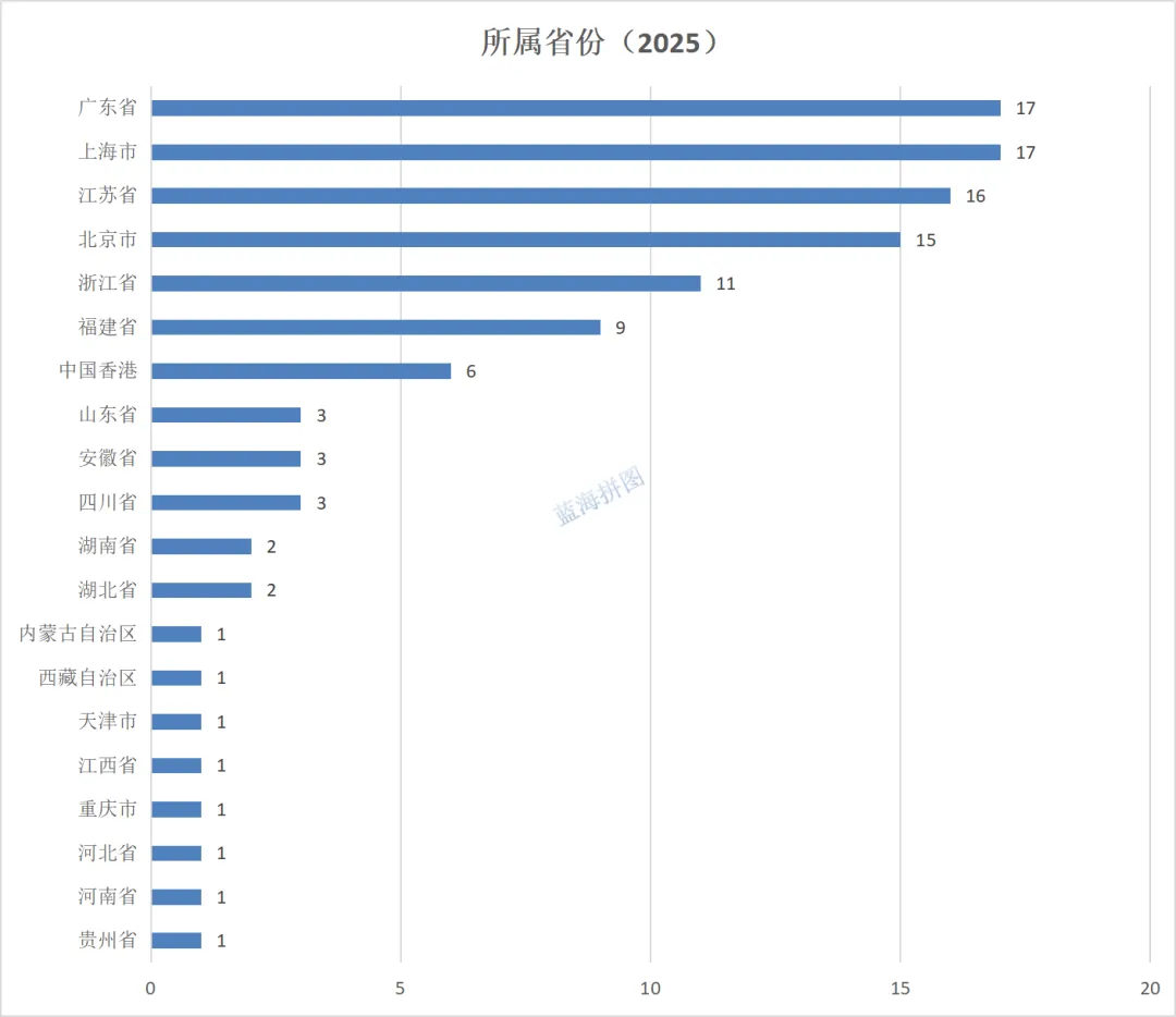 前三的省份分别是:广东省(17)、上海市(17)、江苏省(16)。