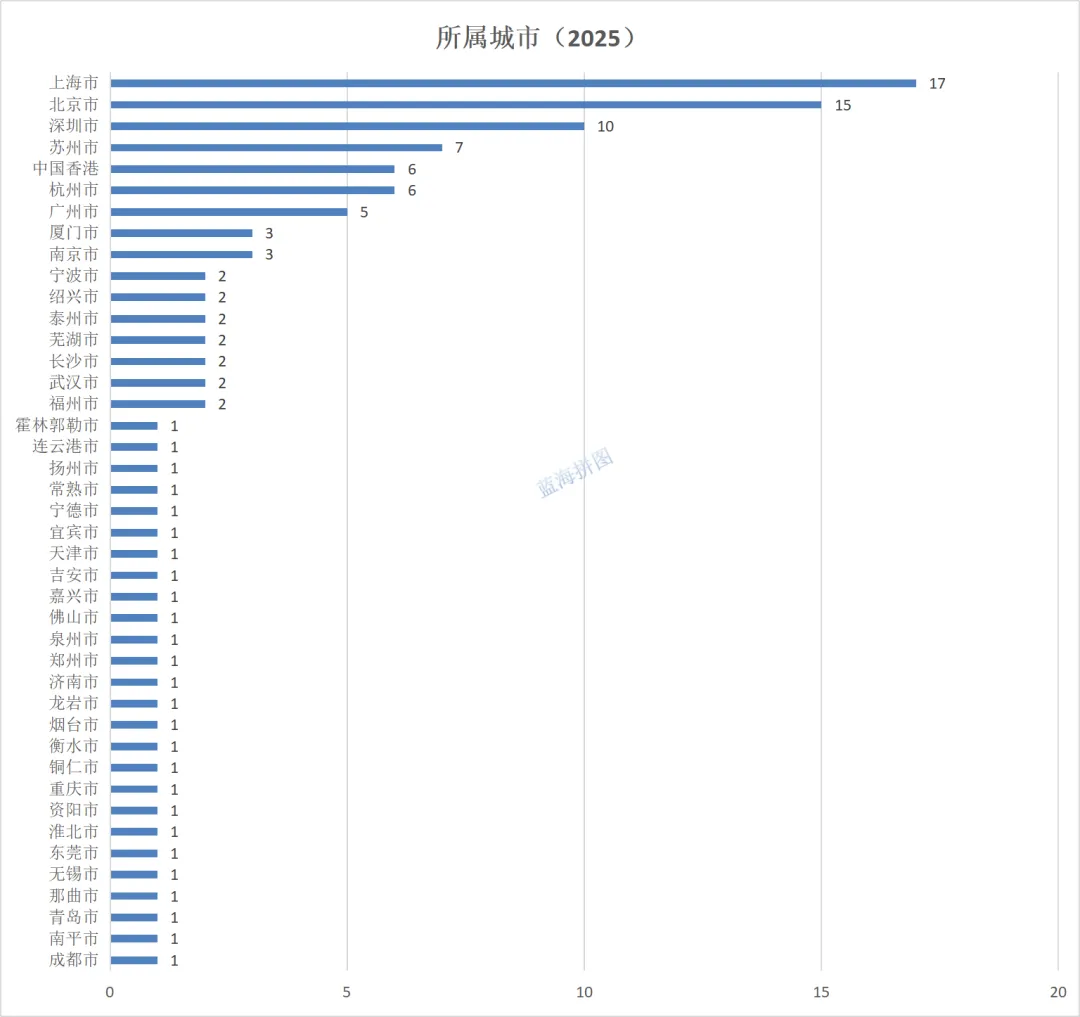 前三的城市分别是:上海市(17)、北京市(15)、深圳市(10)。