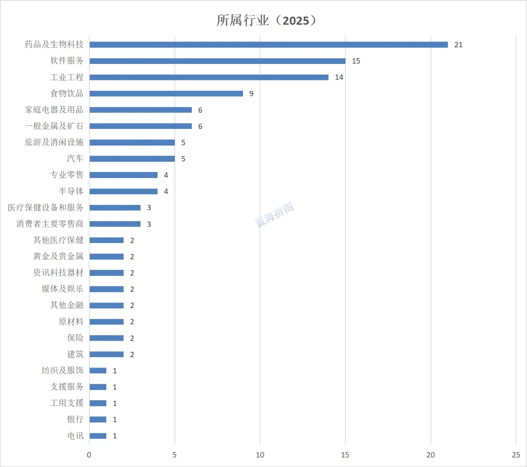 前三的行业分别是:药品及生物科技(21)、软件服务(15)、工业工程(14)。