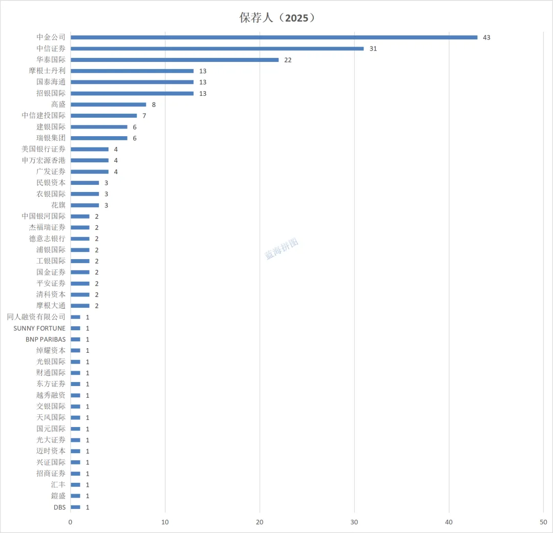 前三的保荐人分别是:中金公司(43)、中信证券(31)、华泰国际(22)。