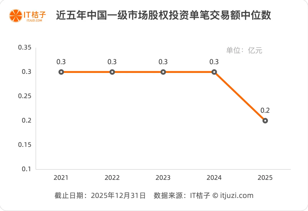 2025年平均每笔投资0.91亿元,但中位数只有0.2亿元,两者相差4.5倍。这说明少数大额交易严重拉高了平均值,而大多数创业公司实际拿到的钱远低于平均水平。