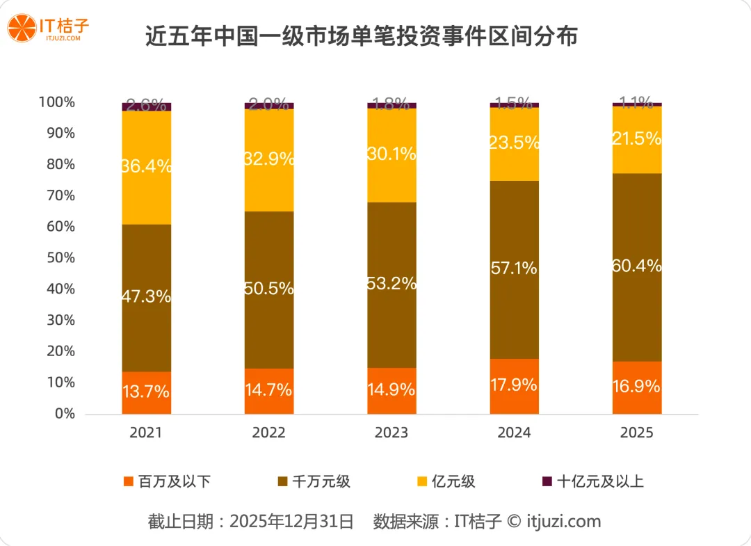 单笔平均投资金额五年缩水近半,中位数首次下降,大额投资占比骤降,千万级投资成为主流——