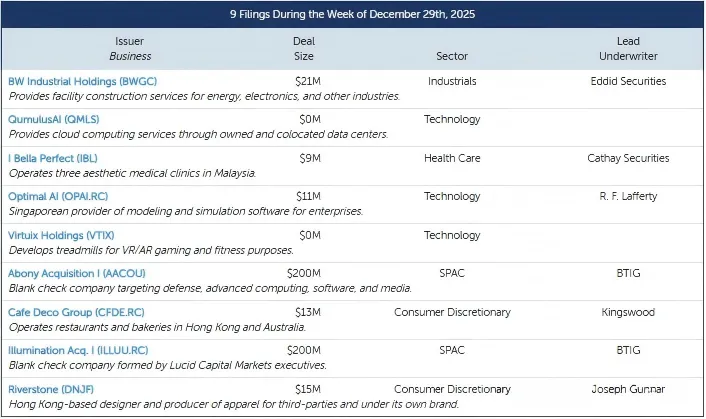 本周有7家首次公开募股(IPO)和2家特殊目的收购公司(SPAC)提交了申请文件。本周没有定价活动。