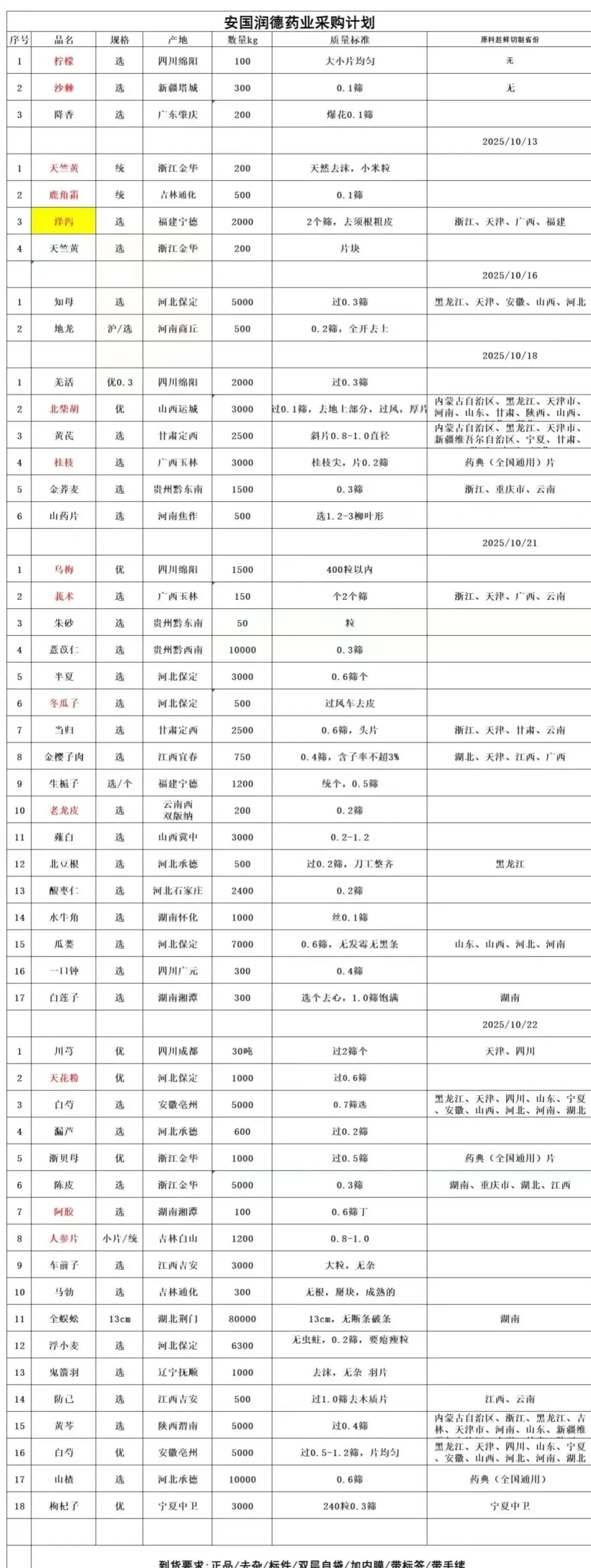 安国润德药业有限公司计划采购48个品种:柠檬、沙棘、降香、天竺黄、鹿角霜、泽泻、知母、地龙、羌活、北柴胡、黄芪、桂枝、金荞麦、山药片、乌梅、莪术、朱砂、薏苡仁、半夏、冬瓜子、当归、金樱子肉、生栀子、老龙皮、薤白、北豆根、酸枣仁、水牛角、瓜蒌、一口钟、白莲子、川芎、天花粉、白芍、漏芦、浙贝母、陈皮、阿胶、人参片、车前子、马勃、全蜈蚣、浮小麦、鬼箭羽、防己、黄芩、山楂、枸杞子 1、准备个人身份证复印件两份,产地资产证2套随货一起到,白袋子双包装(加12丝内膜袋子),每件货带标签进厂。