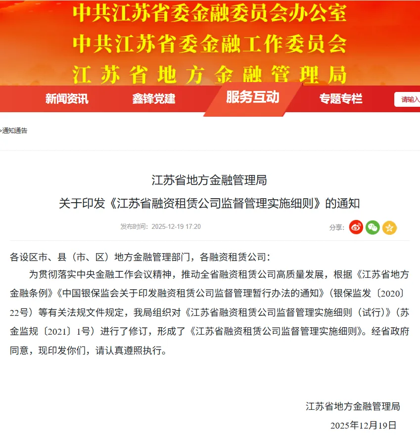 第一条 为加强全省融资租赁公司监督管理,规范融资租赁经营行为,防范化解相关金融风险,促进全省融资租赁行业规范健康发展,根据《中华人民共和国民法典》《中华人民共和国公司法》《江苏省地方金融条例》《市场准入负面清单(2025年版)》《融资租赁公司监督管理暂行办法》以及国家对商用车市场金融业务规定等有关法律法规和政策规定,结合我省实际,制定本细则。