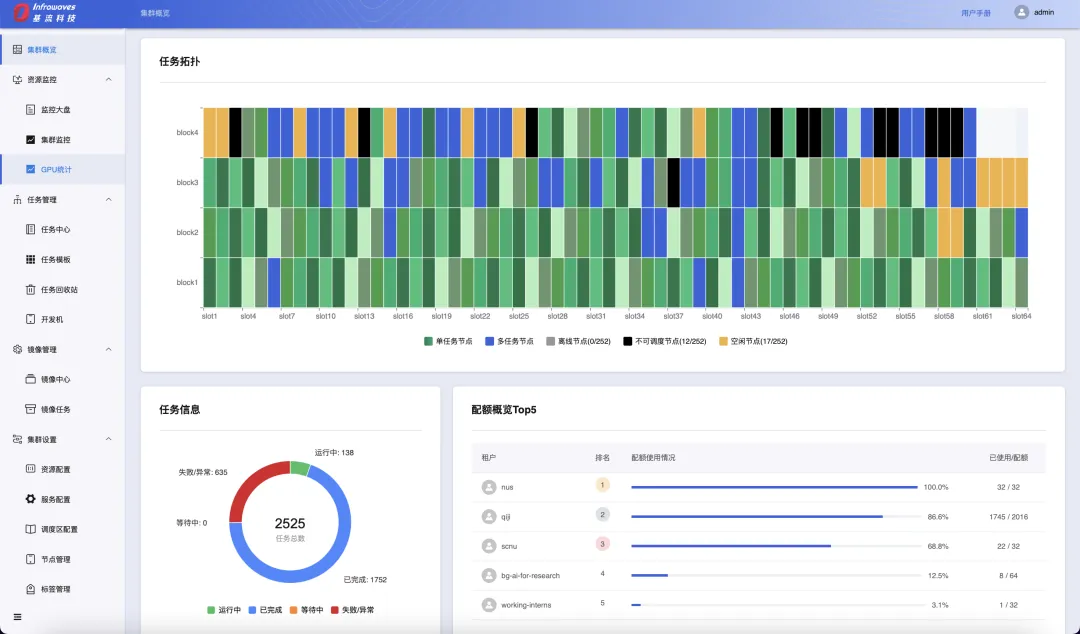 在某大型金融机构算力中心项目中,仅用两个月完成全栈信创落地,纳管5种以上GPU;在海淀区弹性算力实验室项目中,纳管超200P算力,破解AI企业算力资源紧张、调度难等痛点,支持50多家科创企业的机器人及具身智能、AI推理、多模态等多行业场景算力需求,助力企业千亿级模型训练周期缩短近5倍;在上海临港2000P算力集群项目中,实现年化硬件故障率低于1%,训推任务平均无故障时间超过72小时,服务等级协议(SLA)超过99.95%。