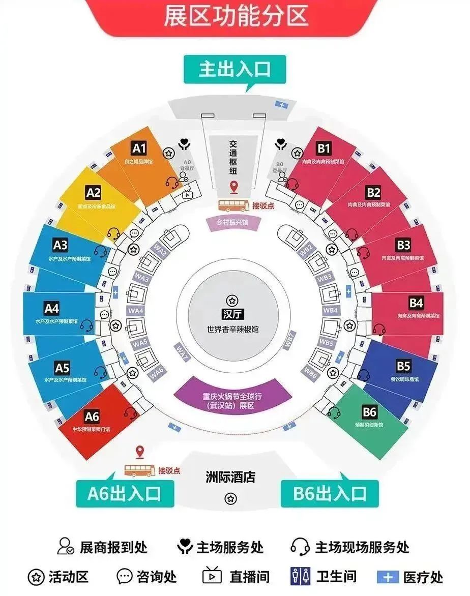 本届食材节规模宏大,不仅在我们武汉国博12个室内展馆全开,二层室外广场也设置了户外展区,同期在武汉客厅也举办了预制菜加工与包装设备展,是2023年行业的首场头部大展。一城双展,展出面积超过20万平方米,展品涵盖了从冻品新鲜食材、加工品、调味品,到熟食、预制菜品,覆盖了餐饮食材上的全产业链。其中,A1馆和A2馆为良之隆品牌馆和面点及冷冻食品馆,A3-A5馆为水产及水产预制菜馆,A6馆为中华预制菜师门馆;B1-B4馆集中展示肉禽及肉禽预制菜,B5馆为调味品馆以及B6馆为预制菜创新馆。