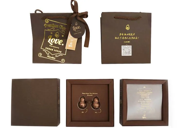 得此典故,茅台的酒心巧克力匠心独运的融合最古老的“合卺酒”的概念,将一个“葫芦”劈成两半,里面的茅台酒心,做成一对,夫妻二人各执一半,代表两人一生同甘共苦。