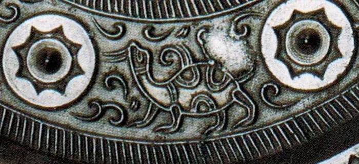 镜背主纹是七枚带内向七连弧座乳钉间分别放置了羽人、玄武、獬、白虎、瑞鸟、朱雀、青龙。