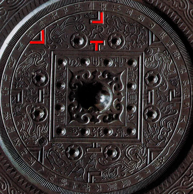 我们可以看到镜背方框的四个角,分别对着“V”形,过去人们将其称为“规”,规是画圆用的工具,今天称之为圆规。