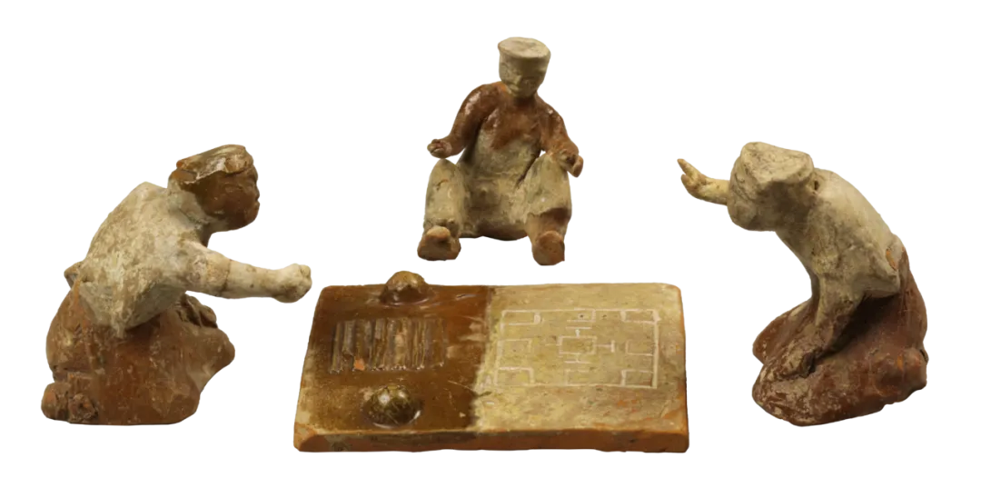 现藏于洛阳龙门博物馆的六博戏陶塑,生动的展现了古人博戏的场景:下棋者席地跪坐,神态专注,二人表情生动形象;观棋者随意而坐,兴趣盎然;棋盘刻画简洁明了。整个画面生动逼真,宛如情景再现。