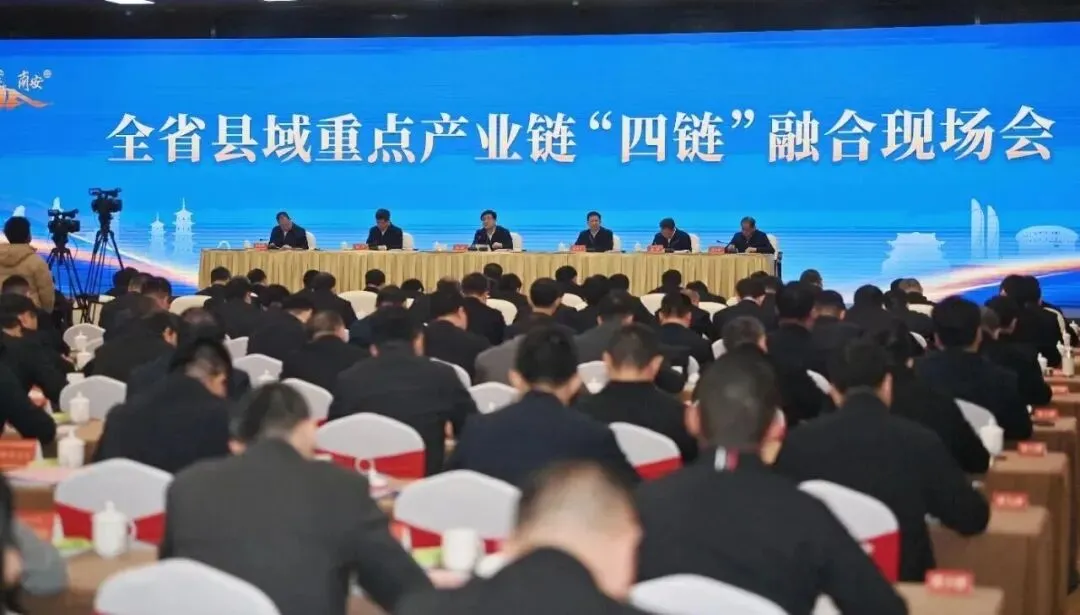 2月7日全省县域重点产业链“四链”融合现场会,奏响新年经济高质量发展的响亮号角。省长赵龙出席并讲话,强调要深入学习贯彻习近平总书记在福建考察时的重要讲话精神,以科技创新引领新质生产力发展,推动创新链产业链资金链人才链深度融合,把县域重点产业链蓬勃发展的势头延续下去,促进发展县域经济,为在中国式现代化建设中奋勇争先提供坚实支撑。