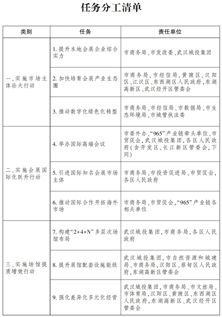 6.推动国际合作开拓海外市场。借助国际会展行业交流合作平台,引入会展项目资源。加强与国际会展组织、国家级商协会以及知名境外展联动,推动有实力的会展企业出海办展组展,打造具有国际竞争力的会展领军企业。支持武汉会展集团整合展商资源赴日本、沙特、意大利等国家组展参展,鼓励中国食材电商节开展中餐供应链出海行动。
