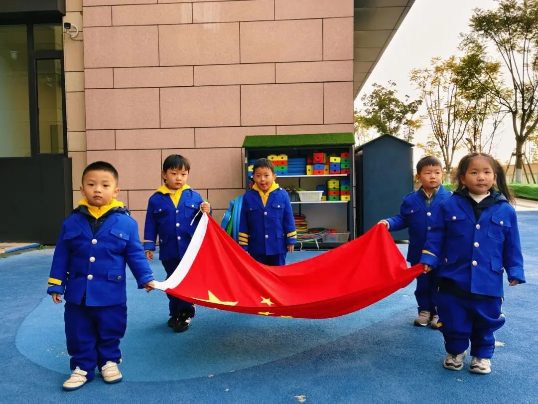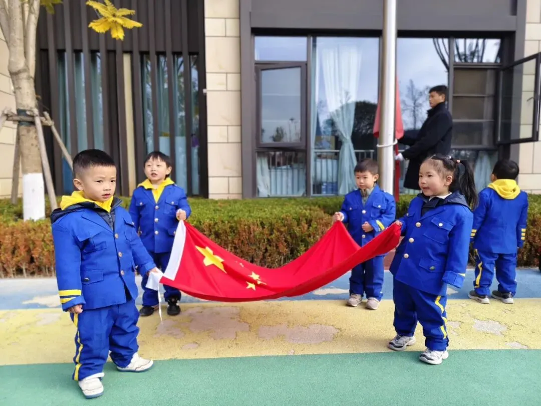 雄壮的国歌响起,鲜艳的五星红旗缓缓升起,全园师幼面向国旗行注目礼,在庄严的仪式中感受爱国情怀。