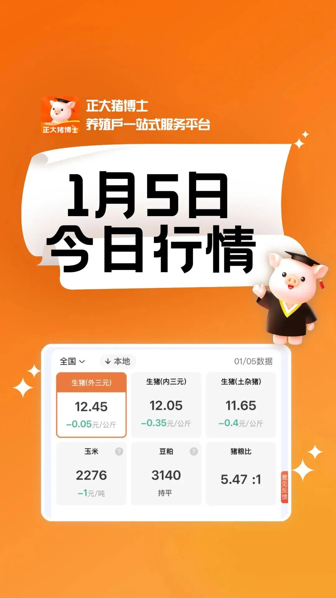 01/05最新猪价来了!今日生猪外三元全国价格微跌,每公斤12.45元;内三元价格下跌,每公斤12.05元;土杂猪价格下跌,每公斤11.65元;玉米原料价格微跌,每吨2276元;豆粕价格持平,每吨3140元;全国猪粮比为5.47:1。