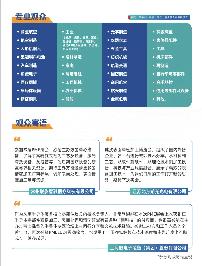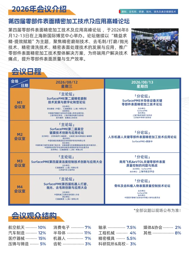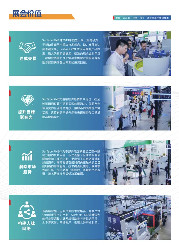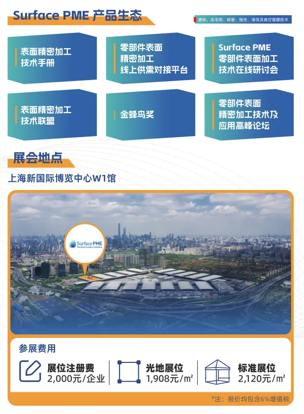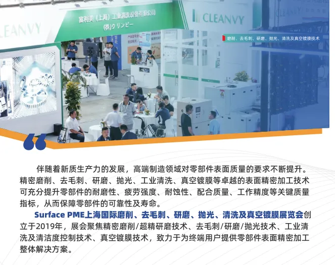 Surface PME上海国际磨削、去毛刺、研磨、抛光、清洗及真空镀膜展览会创立于2019年,展会聚焦精密磨削/超精研磨技术、去毛刺/研磨/抛光技术、工业清洗及清洁度控制技术、真空镀膜技术,致力于为终端用户提供零部件表面精密加工整体解决方案。
