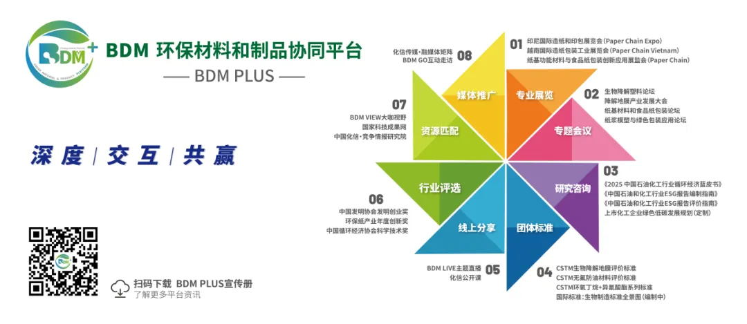 2021年,中国化信聚焦生物降解材料、纸基材料、纸浆和竹浆材料等主要环保材料,重磅打造了BDM PLUS环保平台,设置专业展览、专题会议、研究咨询、团体标准、线上分享、行业评选、资源匹配和媒体推广等八大板块,为业内提供咨询、技术、贸易和传播一站式服务体系。