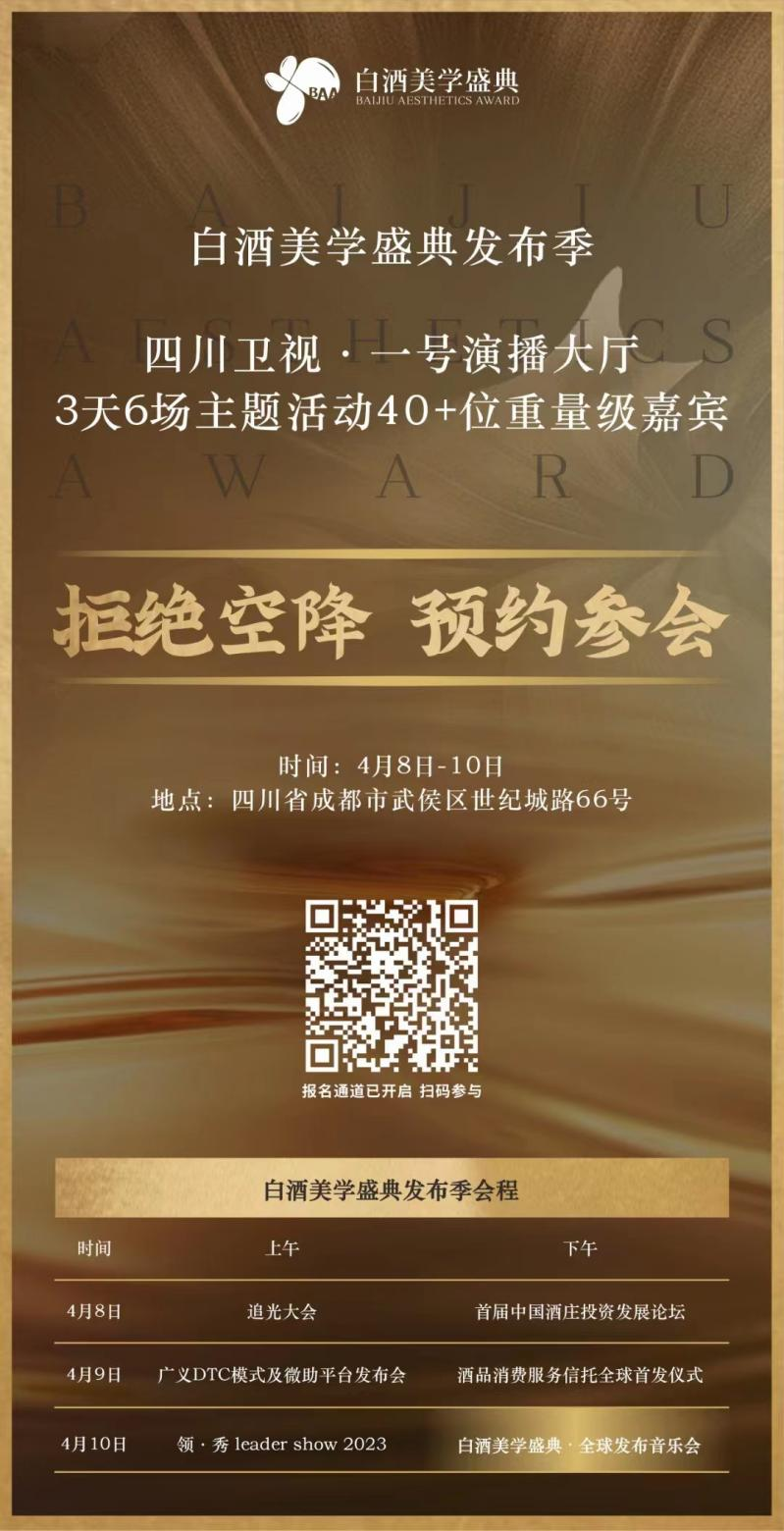 4月8日到10日,在四川广播电视台一号演播大厅,「白酒美学盛典」的共建共创者、支持者将共同参与与见证这一行业盛事的启幕。将连续3天,围绕白酒美学盛典2023发布季举办“追光大会”、“ 首届中国酒庄投资发展论坛”、“ 广义DTC模式及微助平台发布会暨酒品消费服务信托全球首发仪式”、“ 领·秀leader show 2023”,以及“白酒美学盛典·全球发布音乐会”6场主题活动。