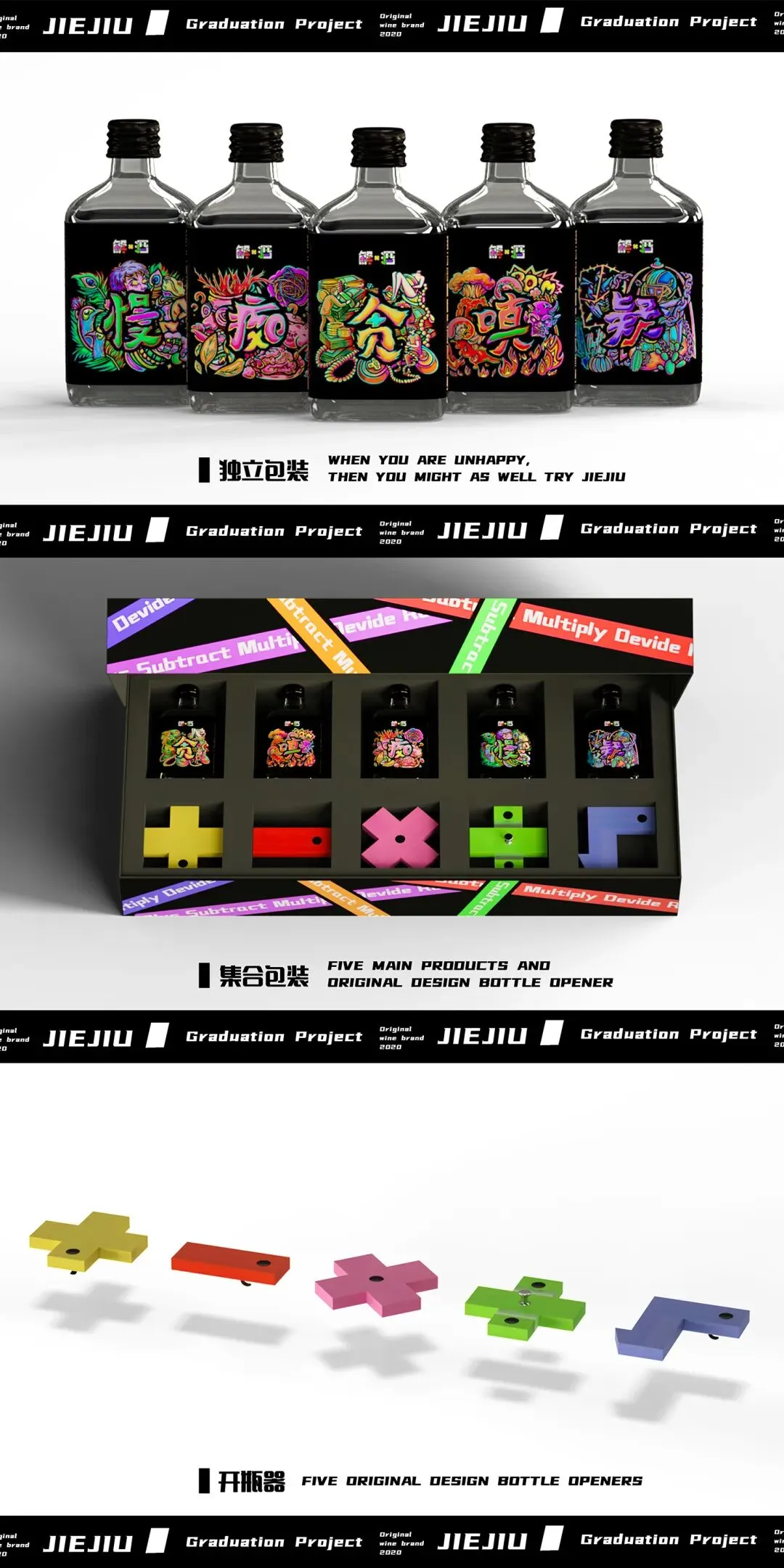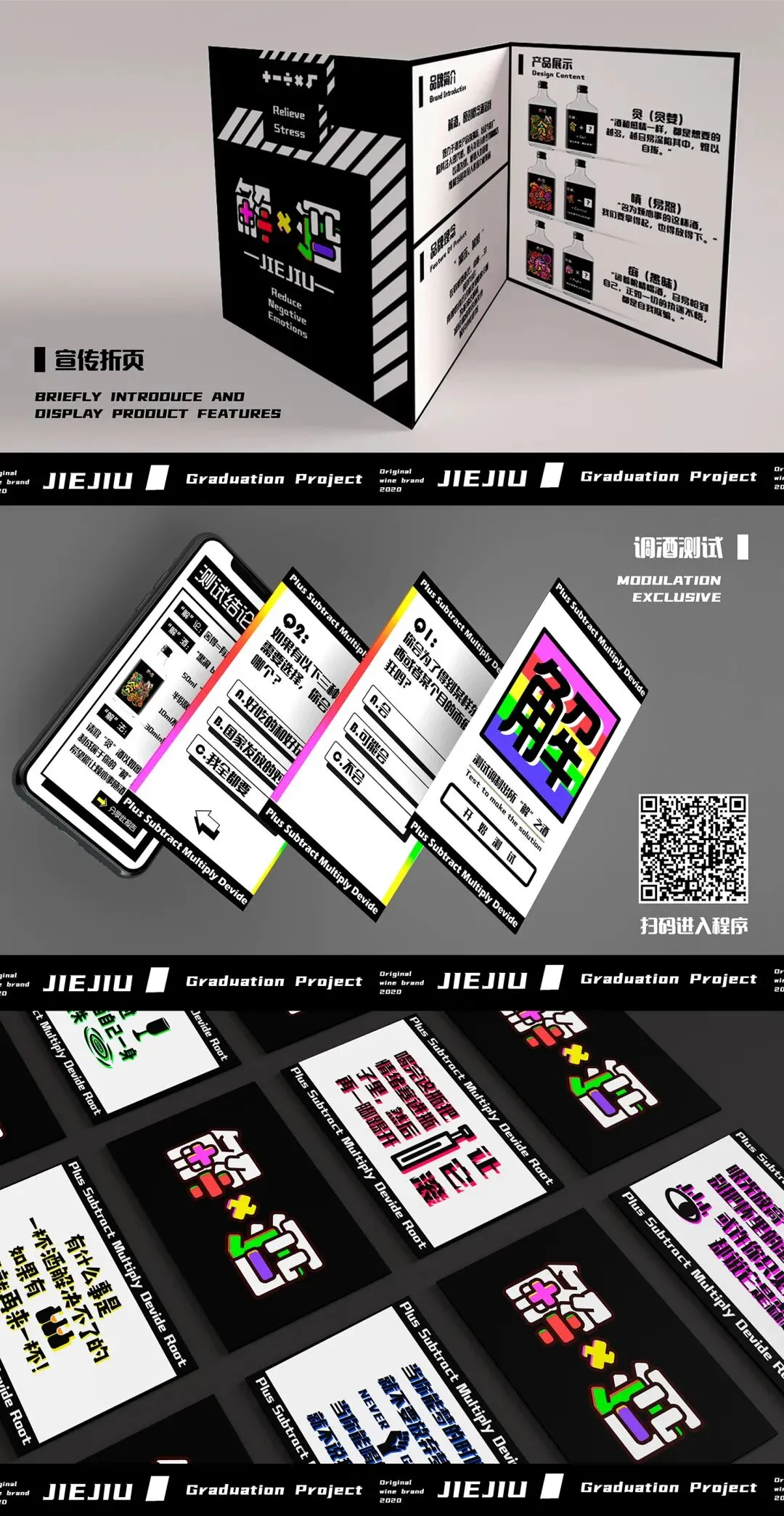 针对当前生活压力的不断累积这一社会现象,通过设计,从“借酒”消愁延伸到“解酒”消愁的概念,运用趣味的计算和调配方式,让人从文案、插画、公式……中得到生活的启发和鼓舞,懂得如何解除内心的烦闷和压力,从而实现感性与理性之间的相互转化,由此来达到“解”这一目的。