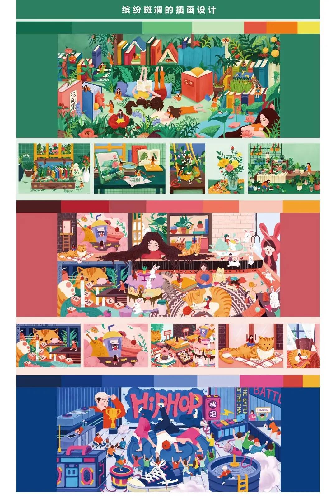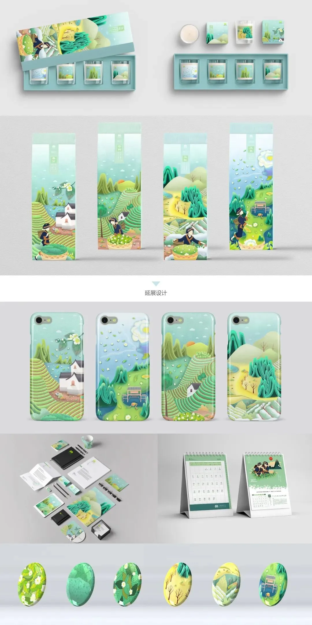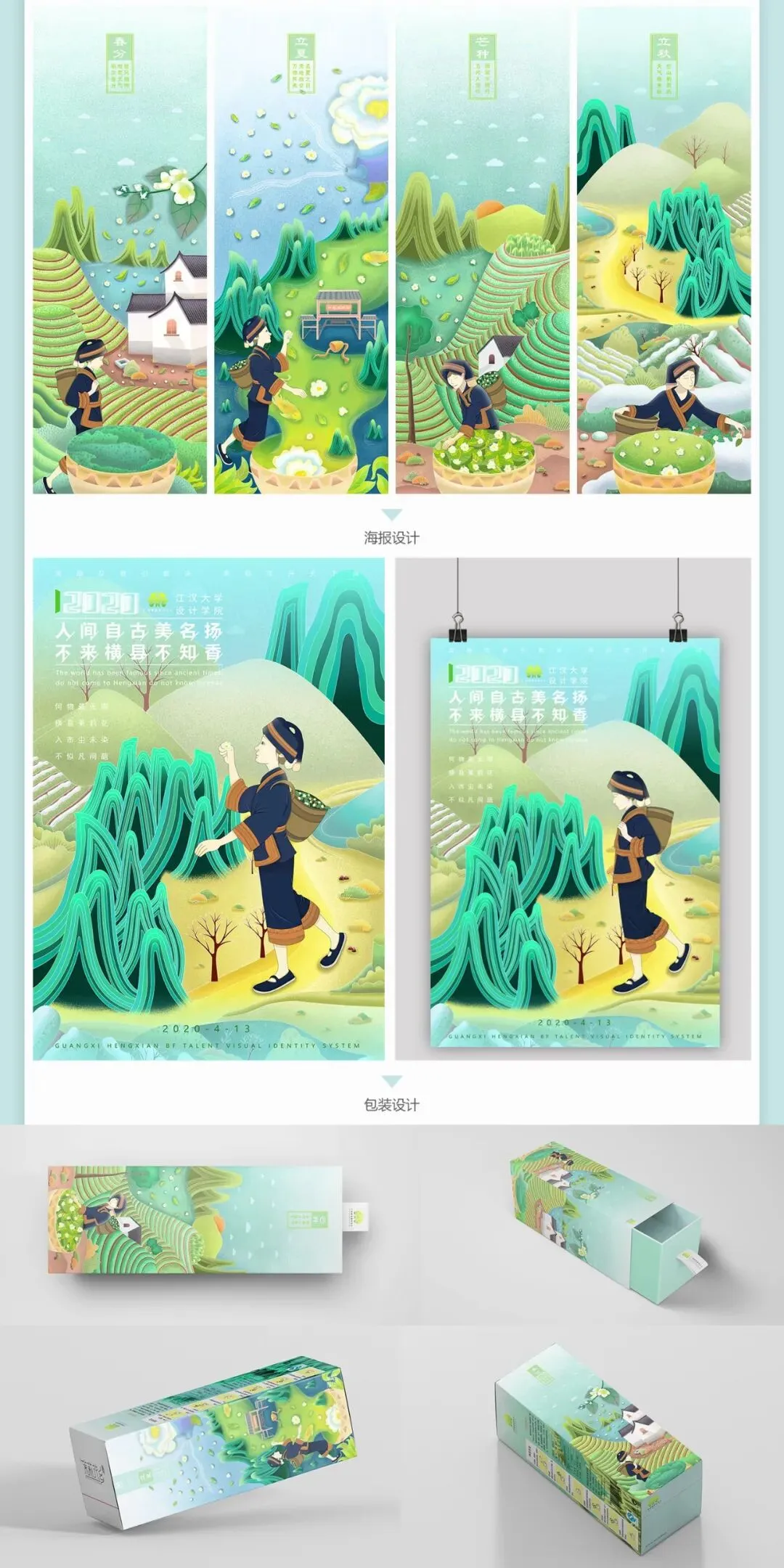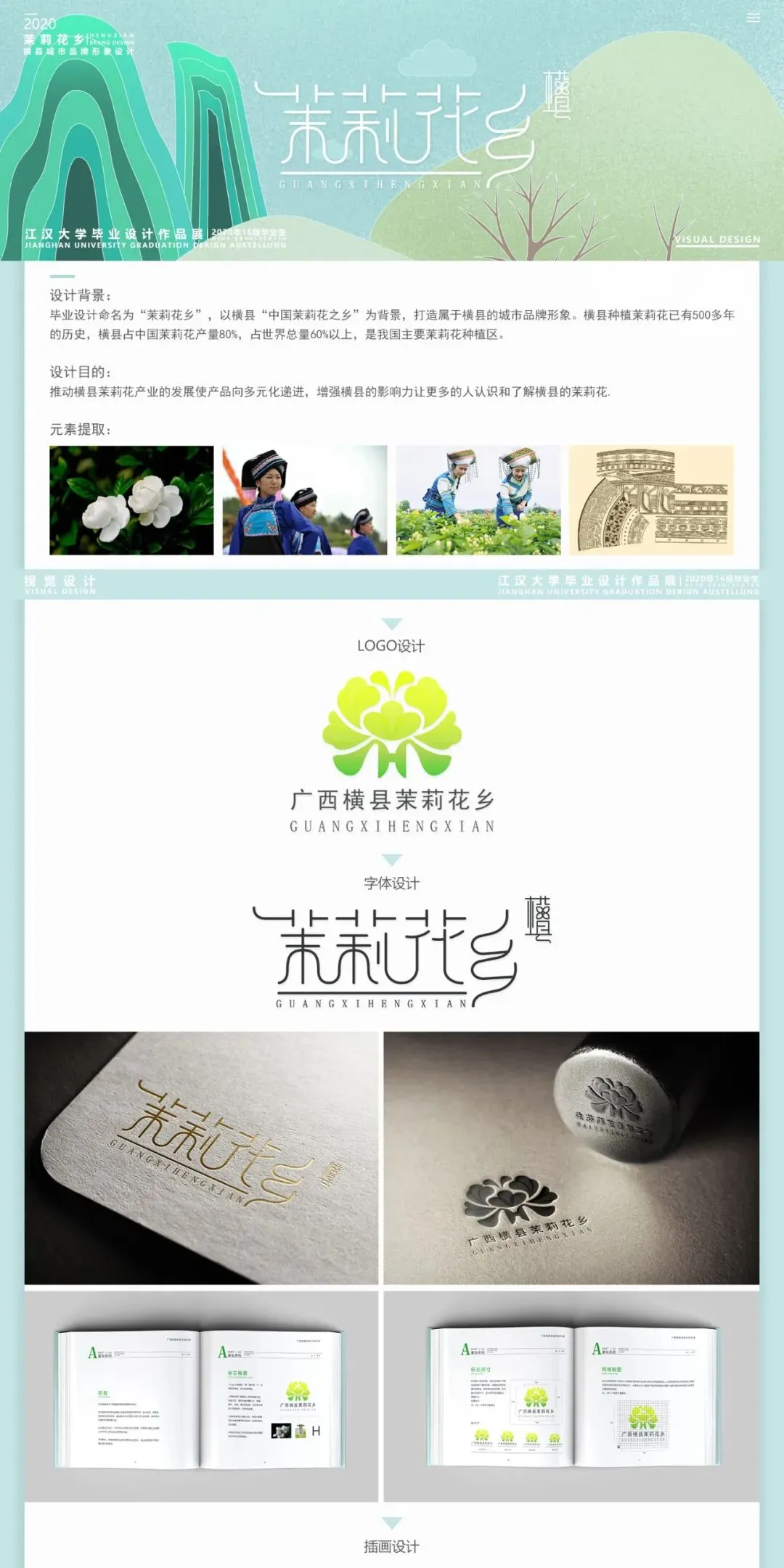 毕业设计以横县为背景“茉莉花乡”为主题,打造属于横县的城市品牌形象。元素提取了茉莉花和壮族人物,用插画的形式呈现茉莉花在春分、立夏、芒种、立秋这几个花开的时节,也反映了茉莉花不同的生长环境及花农采摘茉莉花的不同状态,整体色调为绿色和蓝色。