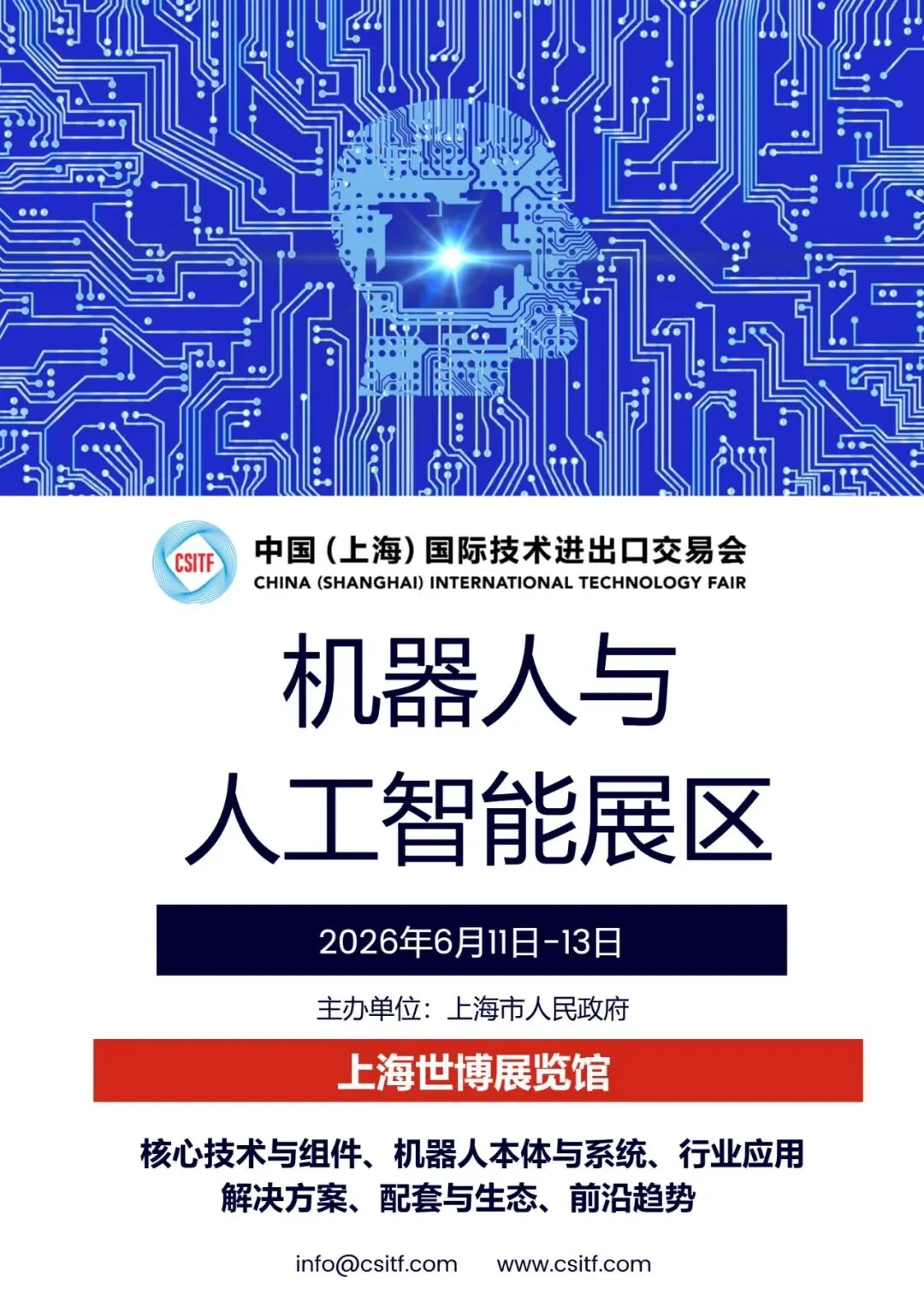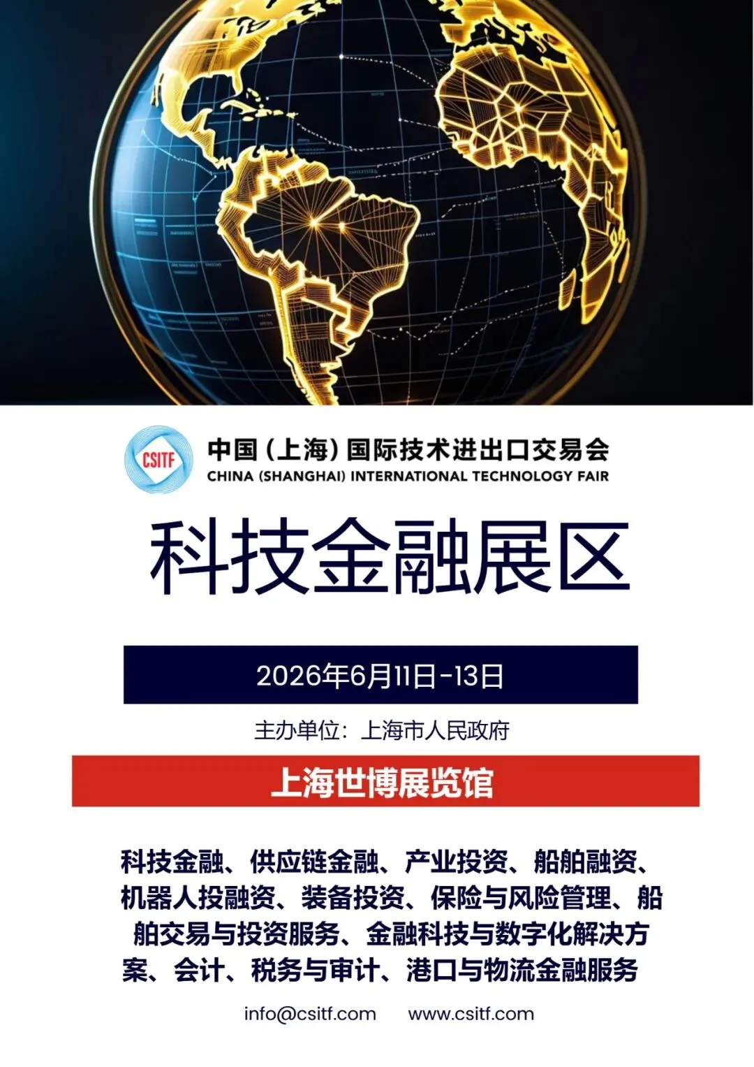 由上海市人民政府主办的国家级、国际性、综合型展会2026年第十二届中国(上海)国际技术进出口交易会(简称“上交会”,英文缩写“CSITF”)将于6月11-13日在上海世博展览馆盛大举办。本届上交会将继续进一步特设科技金融、船舶海工与航运港口、机器人与人工智能等主题展览展区以及系列论坛会议,持续打造具有行业影响力的专业板块。同时国际船舶海工网和低空天地平台将在上交会支持下,同期配套召开2026年科技金融与高端产业投融资上海国际论坛。咨询报名:china@ishipoffshore.com 或 chinabobli@126.com